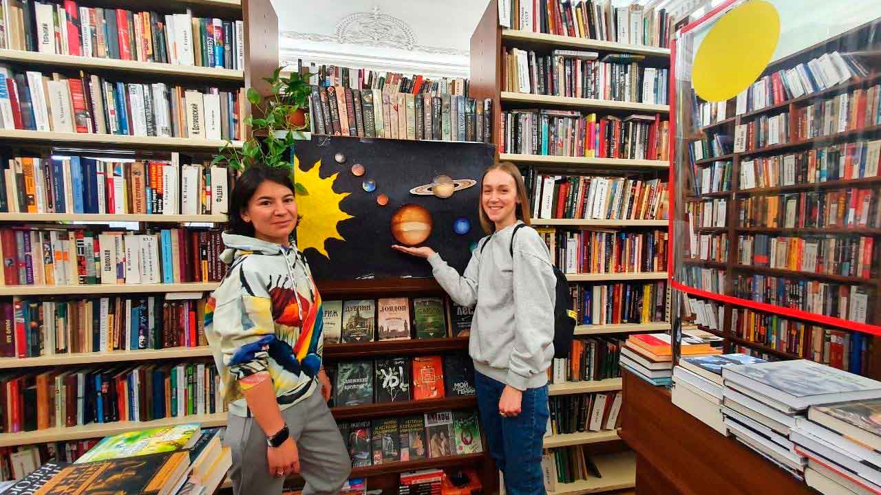 Специально для гостей библиотеки была подготовлена новая выставка книг «Атлас книжного неба». «Атлас» представил собой карту-схему звездного неба, но вместо звезд и созвездий – книги о космосе различных жанров и направлений, от работ известных астрологов до космических антиутопий. Передвигаясь по стрелочкам, посетители могли найти подходящую им книгу.