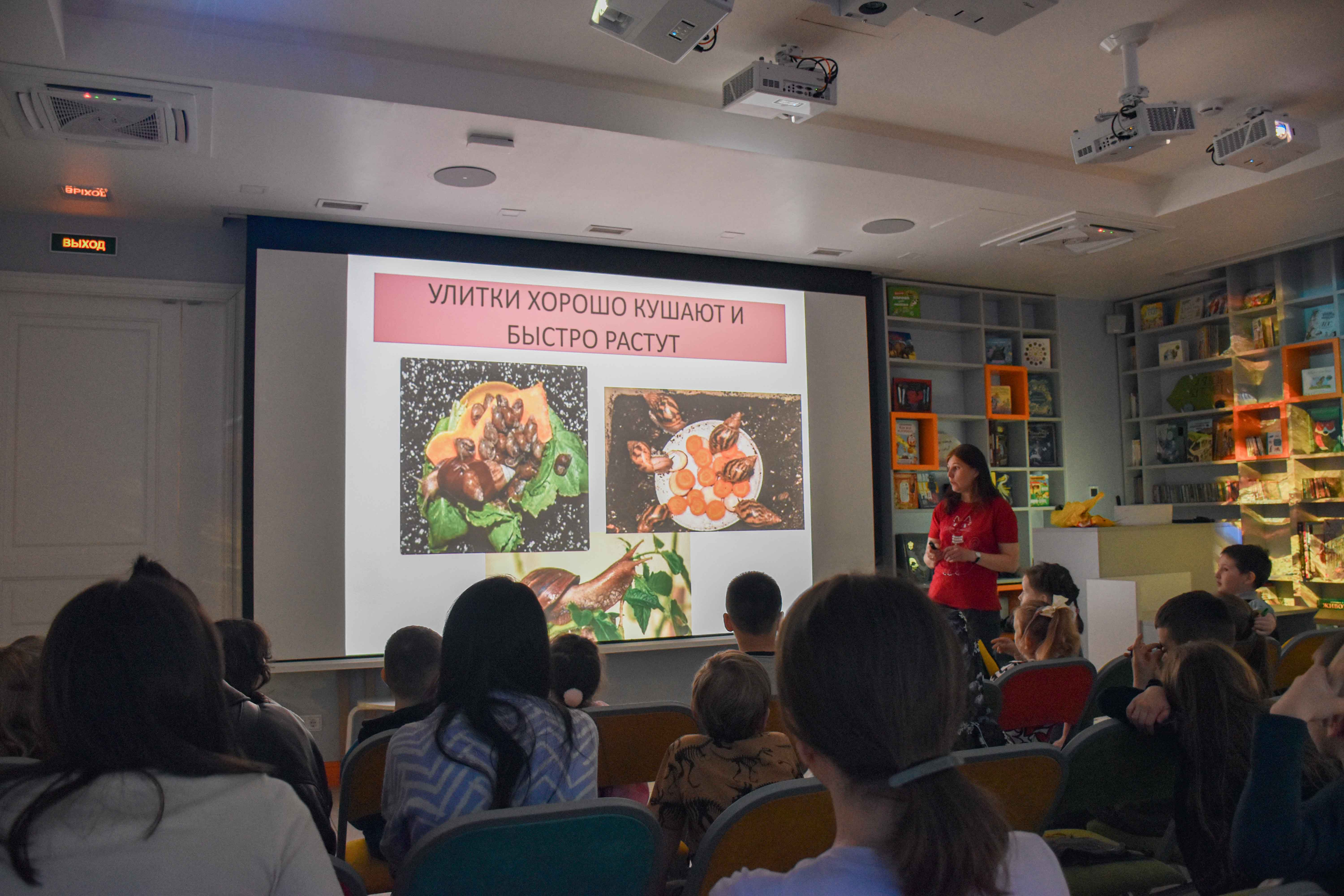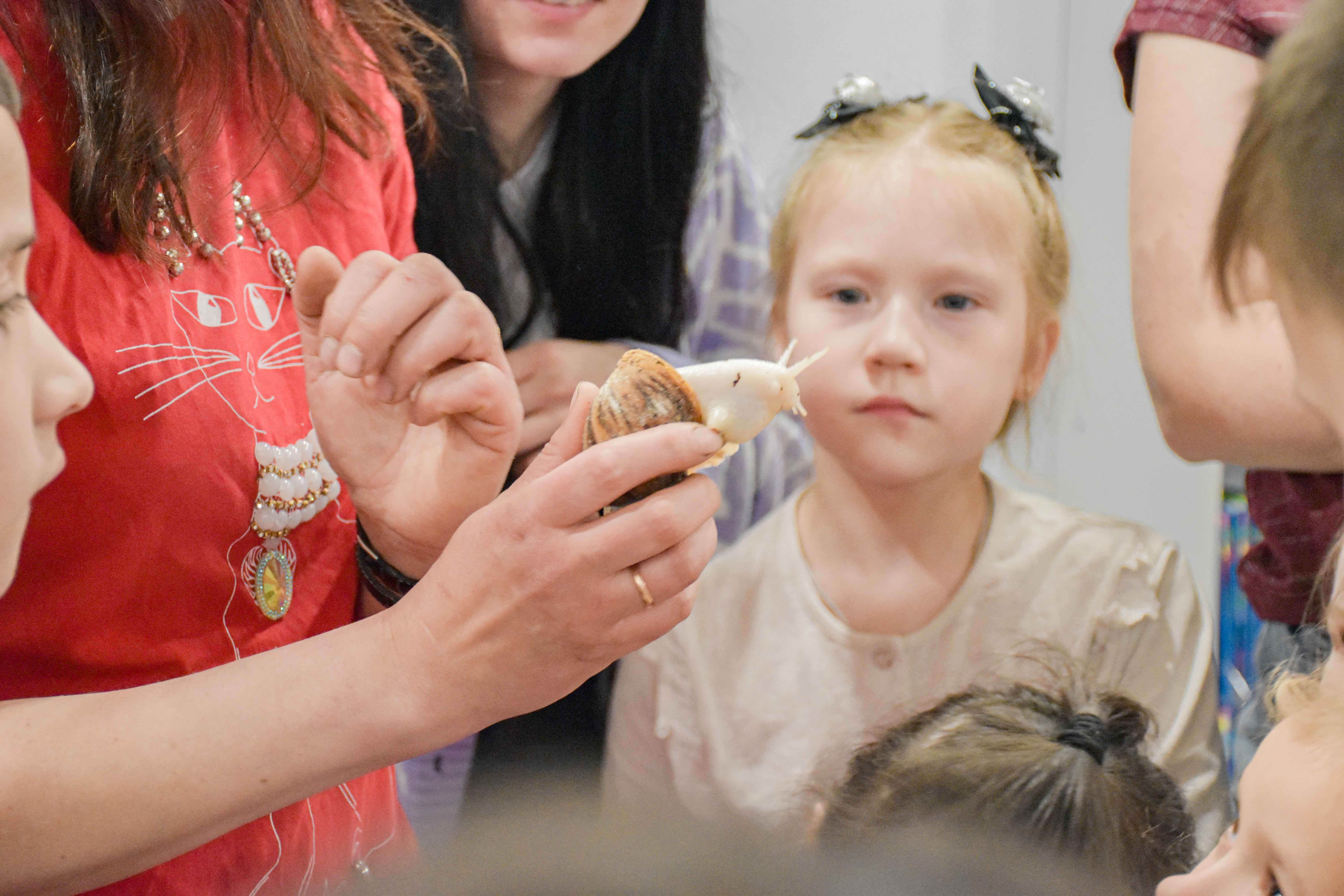 Светлана Владимировна Кудрявцева, педагог «Биотопа», не только очень интересно и подробно рассказала об удивительных гигантских улитках - ахатинах, но и, конечно, познакомила детей с этими необычными существами. Оказывается, ахатины могут прожить целых 10 лет, если о них правильно заботиться. А ешё было доказано наличие у ахатин долговременной памяти: они запоминают расположение источников пищи и возвращаются к ним. Ползают они достаточно быстро и имеют свои вкусовые предпочтения: одни любят огурцы, а другие выбирают морковку. Может быть, ахатины и своих хозяев запоминают и умеют отличать от незнакомых людей?