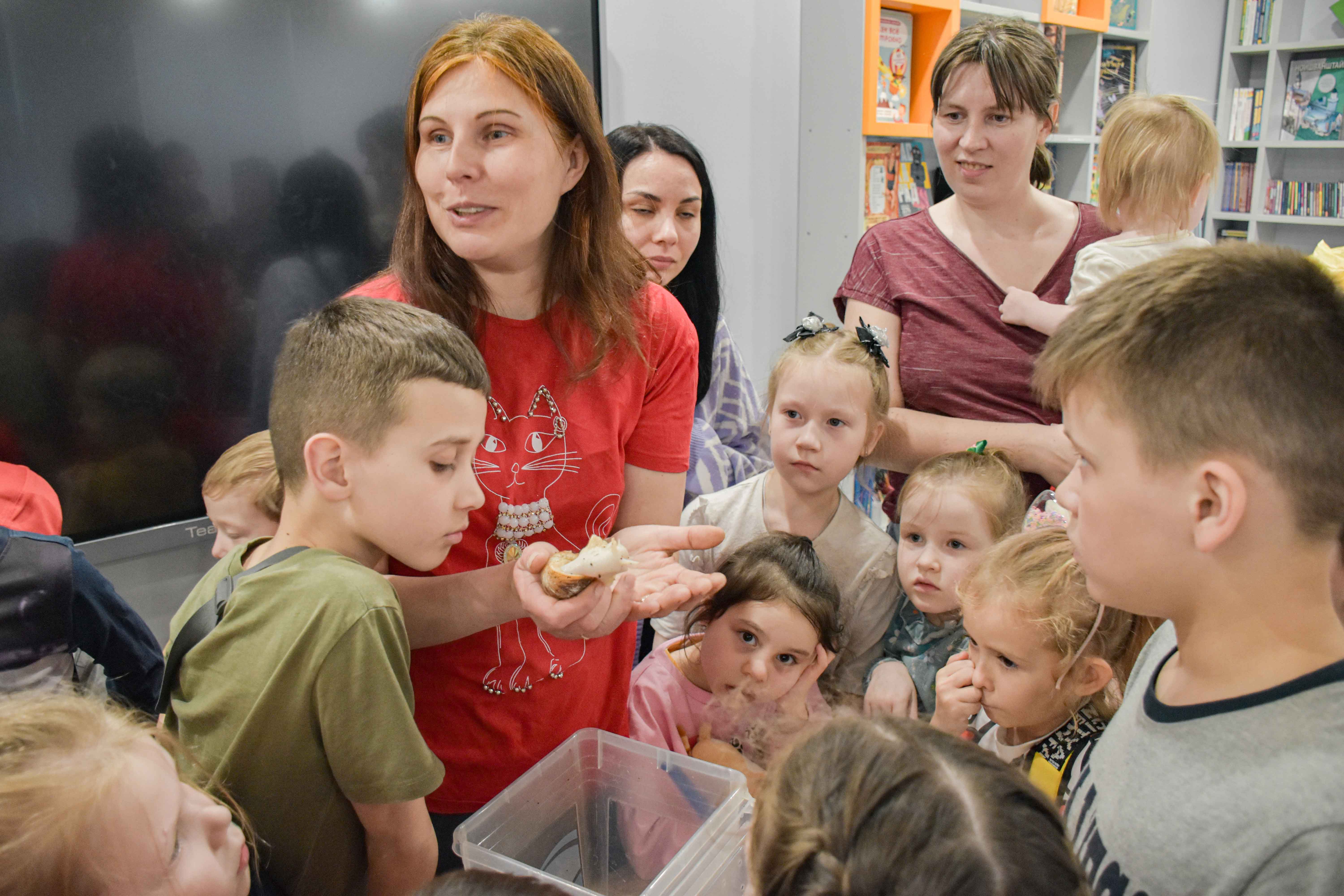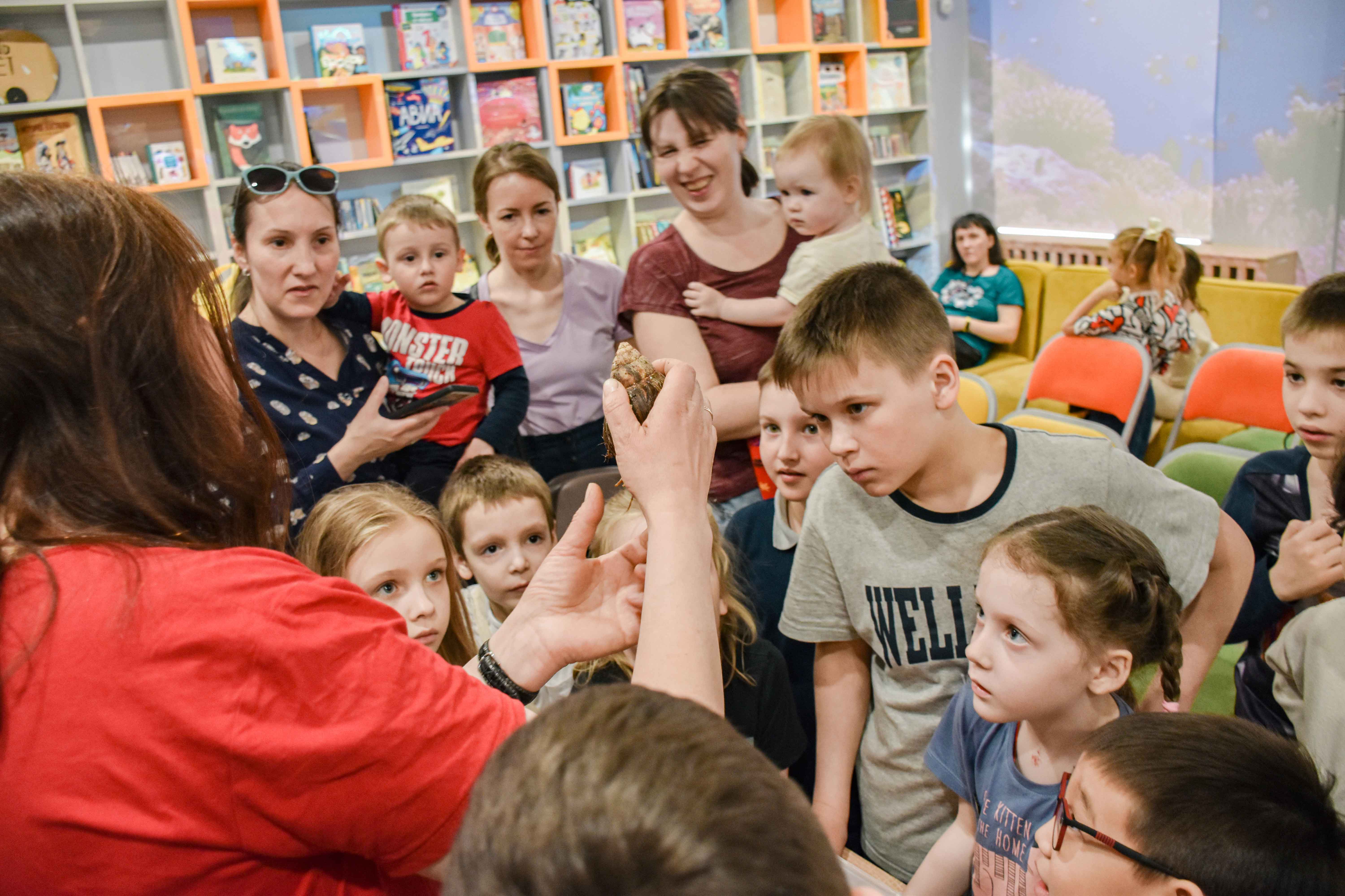 Библиотеку и эколого-биологический центр «Биотоп» связывает давняя дружба: специалисты центра приходят к маленьким читателям в гости и рассказывают удивительные факты из жизни живой природы уже более пяти лет. На каждую встречу сотрудники «Биотопа» приносят с собой пернатых и лохматых, а, иногда, и чешуйчатых, и колючих питомцев. И не только их показывают, но и разрешают пообщаться с ними и погладить. В гостях у ребят уже побывали хомячки и морские свинки, кролики, домашние мышки и крысы, попугаи, ёжики, черепахи… А на этот раз участников «Дня открытых зверей» ждала встреча с загадочной ахатиной!