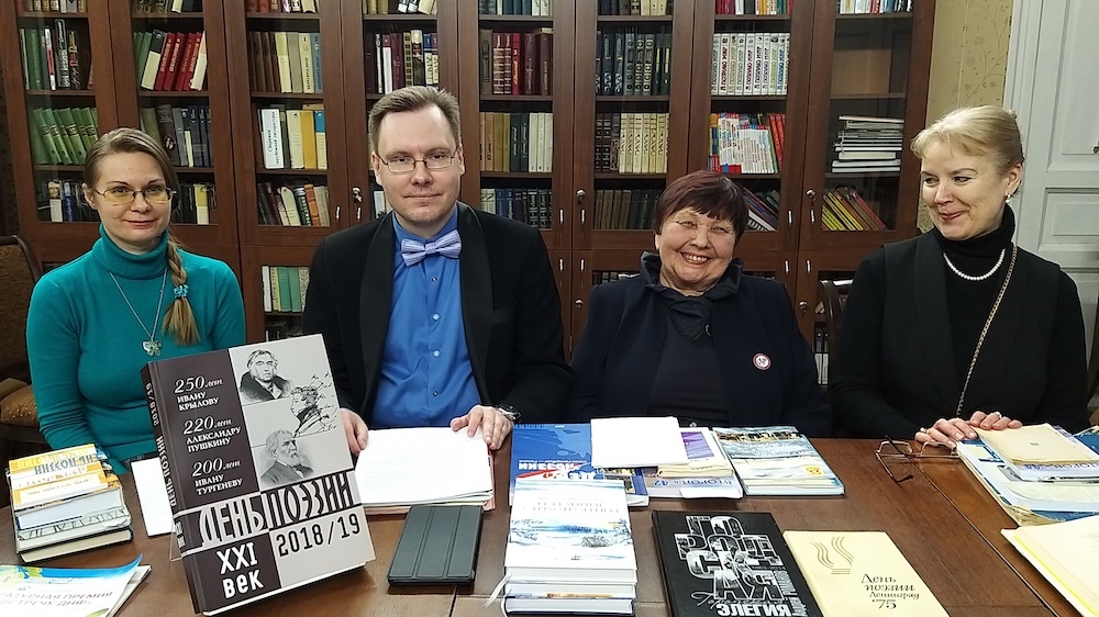 О работе над выпуском альманаха «День поэзии — XXI век, 2018/19» рассказали: поэт, ведущий проекта «Диалоги литературных поколений» Кирилл Козлов, Мария Сергеевна Инге-Вечтомова — внучка поэтессы Елены Вечтомовой и поэта Юрия Инге, старший научный сотрудник Государственного литературного музея «ХХ век», Валентина Александровна Рыбакова, главный редактор журнала «Второй Петербург» и Нестерова Светлана Евгеньевна, библиограф библиотеки имени Аркадия Гайдара, руководитель библиотечного проекта «Книжная полка со стихами».