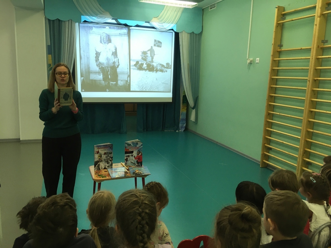 14 февраля сотрудник Юношеской библиотеки им. А. П. Гайдара пришла к воспитанникам детского сада № 82 (Аптекарский пр-т, д. 18 ). Библиограф Светлана Нестерова рассказывала ребятам, как четыре полярника покорили Арктику.