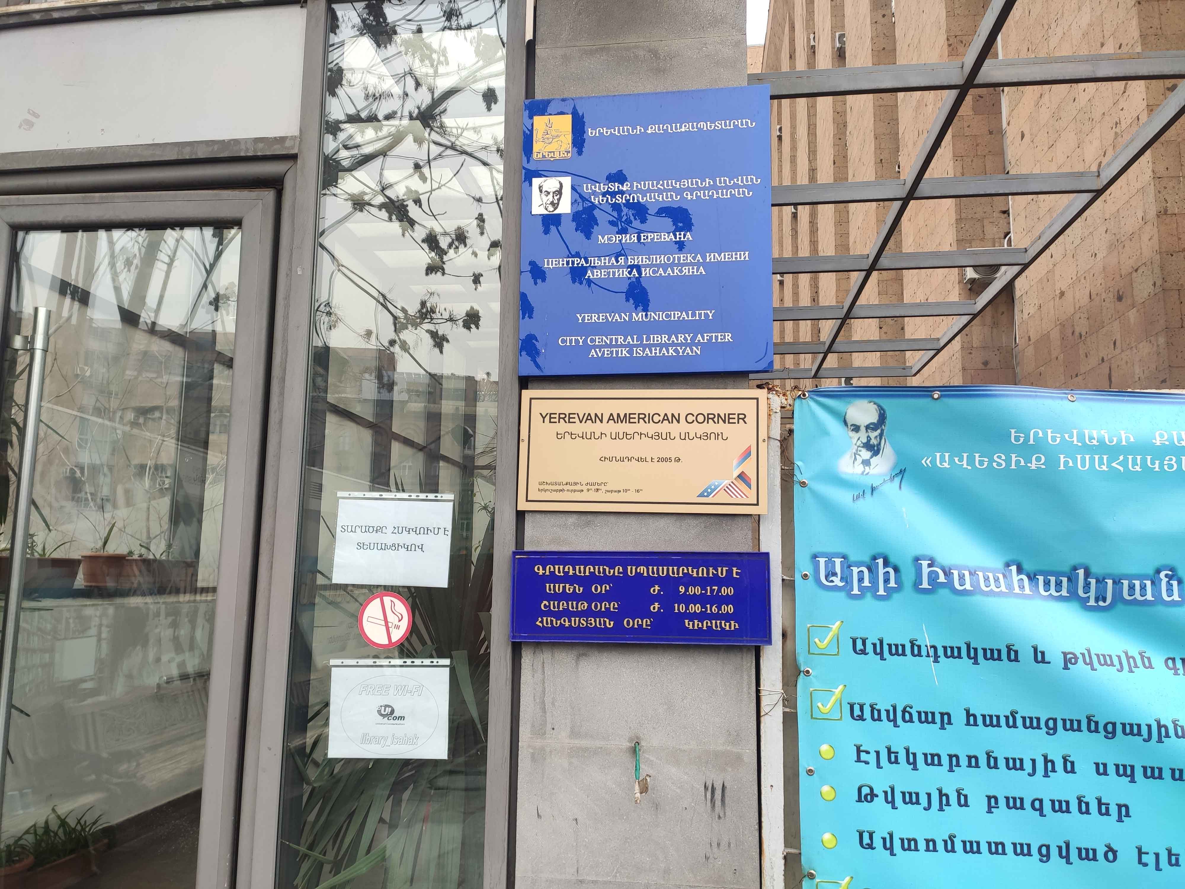 Ереванская Центральная городская библиотека имени Аветика Исаакяна начала свою историю в 1935 году - тогда, когда была открыта первая массовая библиотека. Сегодня в структуре ЦГБ 9 филиалов. Наряду с богатейшим библиотечным фондом, где читатель может выбрать книгу на любой вкус, библиотека оснащена новейшими технологиями: в распоряжении посетителей бесплатная услуга Wi-Fi, база данных онлайн, возможность пользоваться электронными ресурсами, читать электронные книги, использовать электронное устройство «Kindle».