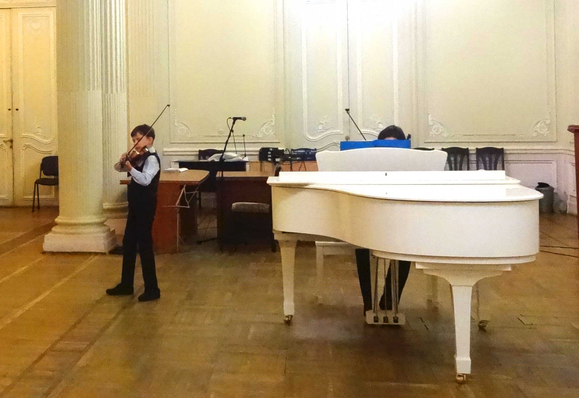 Открыли первый концерт юбилейного сезона юные музыканты – учащиеся средней специальной музыкальной школы при Санкт-Петербургской консерватории им. Н.А. Римского-Корсакова: Георгий Гассиев (фортепиано) исполнил этюды К. Черни и К.А. Лешгорна, и Трёхголосую фугу И.С. Баха, а Константин Коптев (скрипка) – Балетные сцены Шарля Берио.