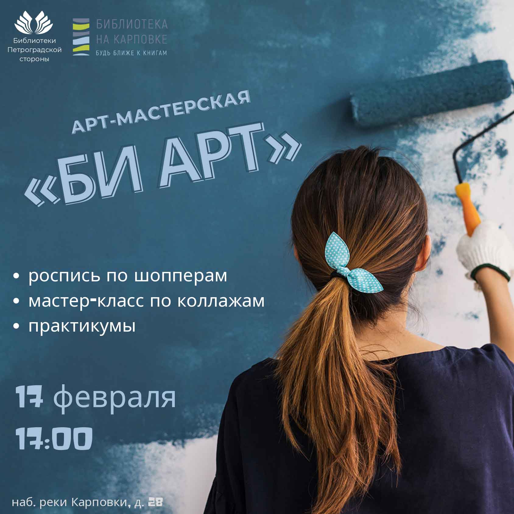 Библиотека на Карповке 17 февраля на несколько часов превратится в настоящую лабораторию художников, поэтов, коллажистов и самых творческих личностей. Всех участников арт-мастерской «Би Арт» ждут два мастер-класса: по росписи шопперов и технологии создания коллажей. А также два практикума, посвященные психологии магии цвета и композиции в художественных и поэтических работах.