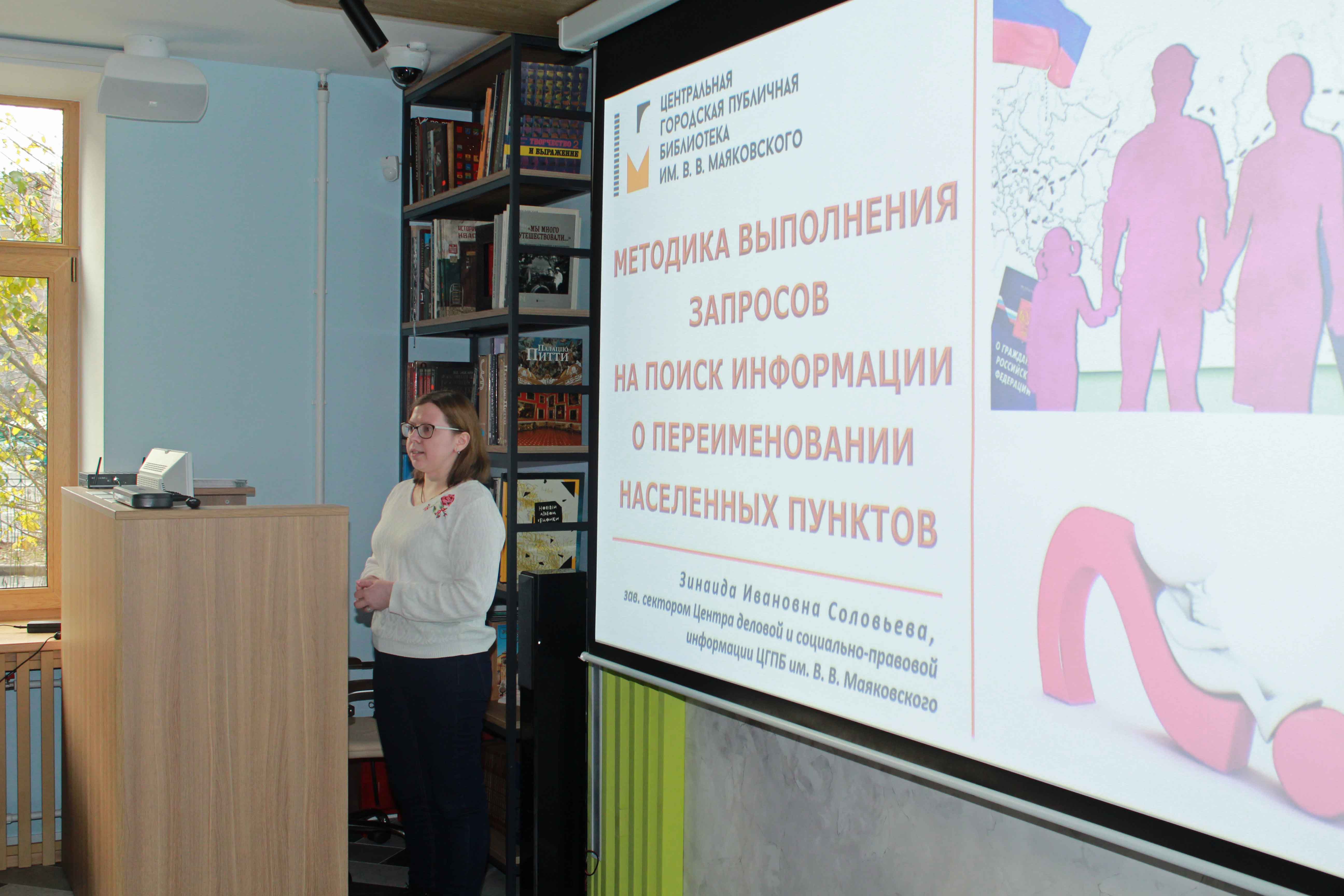О методике выполнения запросов пользователей на поиск информации о переименовании населенных пунктов для оформления документов в профильных подразделениях ГУ МВД России по Санкт-Петербургу рассказала Соловьева Зинаида Ивановна, зав. сектором Центра деловой и социально-правовой информации ЦГПБ им. В. В. Маяковского.