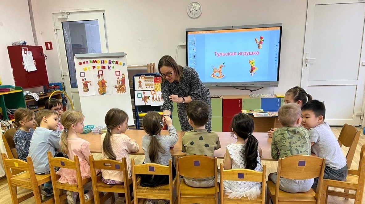 Все игрушки из глины делали примерно одинаково: лепили, сушили, обжигали в печах, а потом раскрашивали. Именно росписью отличались глиняные фигурки друг от друга. Например, филимоновская игрушка отличается символическим орнаментом в виде желтых, красных и зеленых полос, елочек, концентрических кругов. Ребята также познакомились и с тульской городской игрушкой — русским народным художественным промыслом, сформировавшимся в Туле в XVIII–XIX веках. Их изготовлением в основном занимались женщины, а главной темой были образы зажиточных горожан, одетых в характерные для своего времени костюмы, дающие достаточно наглядное представление о моде. Дети нашли отличия этих кукол. В ходе занятия все дети нарисовали свою Филимоновскую игрушку.