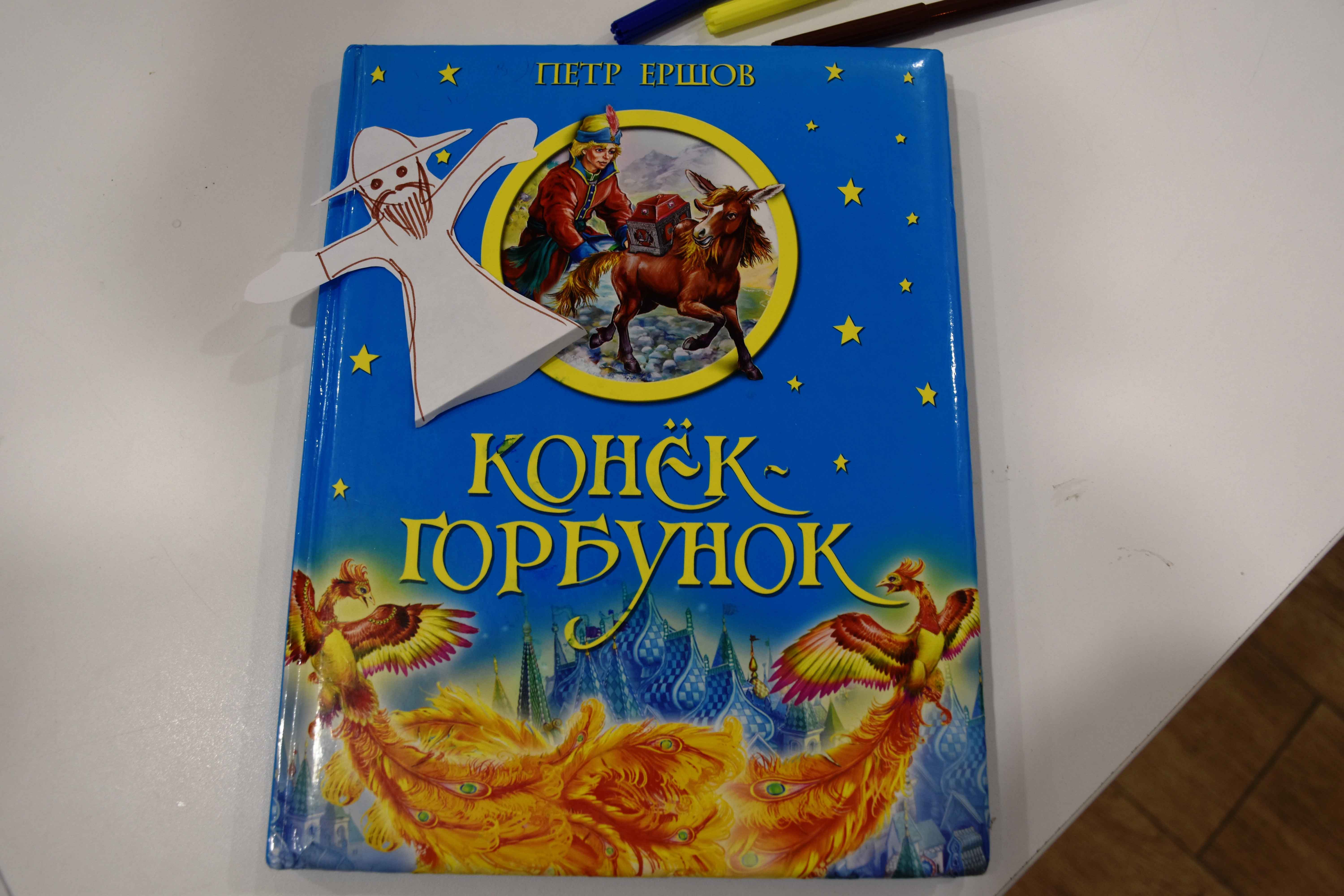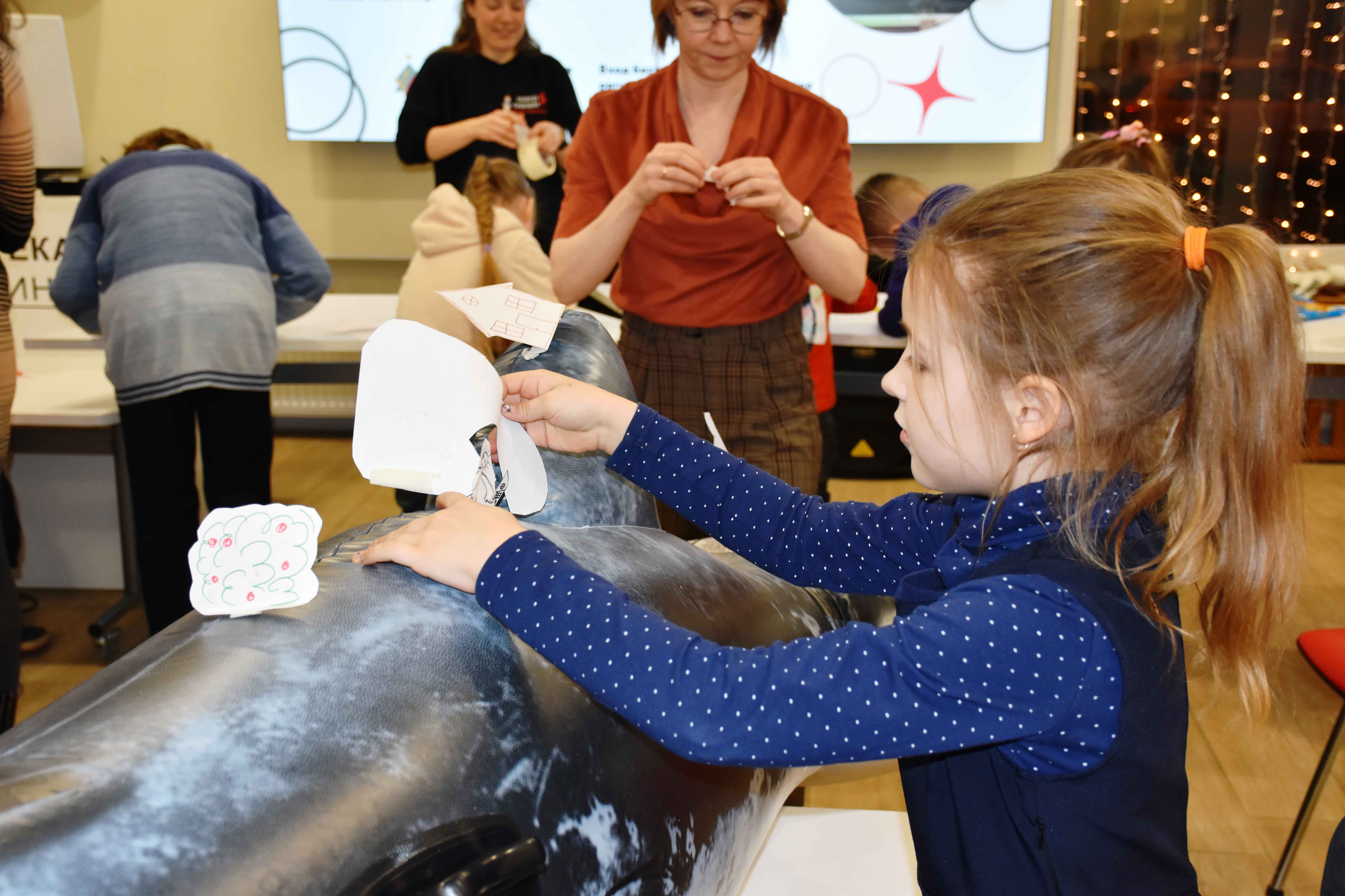 Пришло время самим участникам встречи попробовать себя в роли бутафоров. Библиотекари напомнили детям сюжет сказки «Конёк-Горбунок», особенно тот эпизод, где Иванушке встречается Чудо-юдо рыба-кит, огромное живое существо, уже почти превратившееся в остров. На нем растут деревья, стоят дома, играют дети и пашут поле мужики. Прослушав отрывок из сказки, дети буквально за 15 минут попробовали воссоздать эту сцену. Каждый нарисовал и вырезал из обычной бумаги дом, человека и дерево, а некоторые успели сделать цветы, мельницу, и даже единорога и двух драконов! С помощью бумажного скотча фигурки были размещены на спине и плавниках кита, а после краткой экскурсии по новому поселению, все участники задумались, нравится ли киту такое веселье. Вспомнили, почему в сказке кит терпит мучения и как избавился от них. В этот момент все присутствующие уже были вовлечены в происходящее: сопереживали киту, пели вместе с актрисой частушки, шумели, как океан и кричали как чайки. И когда, наконец, кит освободится от обязанности нести на себе лес и деревню, дети дружно помогли ему «уплыть», держа его на кончиках пальцев, ка на волнах. Даже фотограф не смогла не принять участие в этом трогательном моменте, поэтому фотографии кита, плывущего над детьми, не сохранилось.