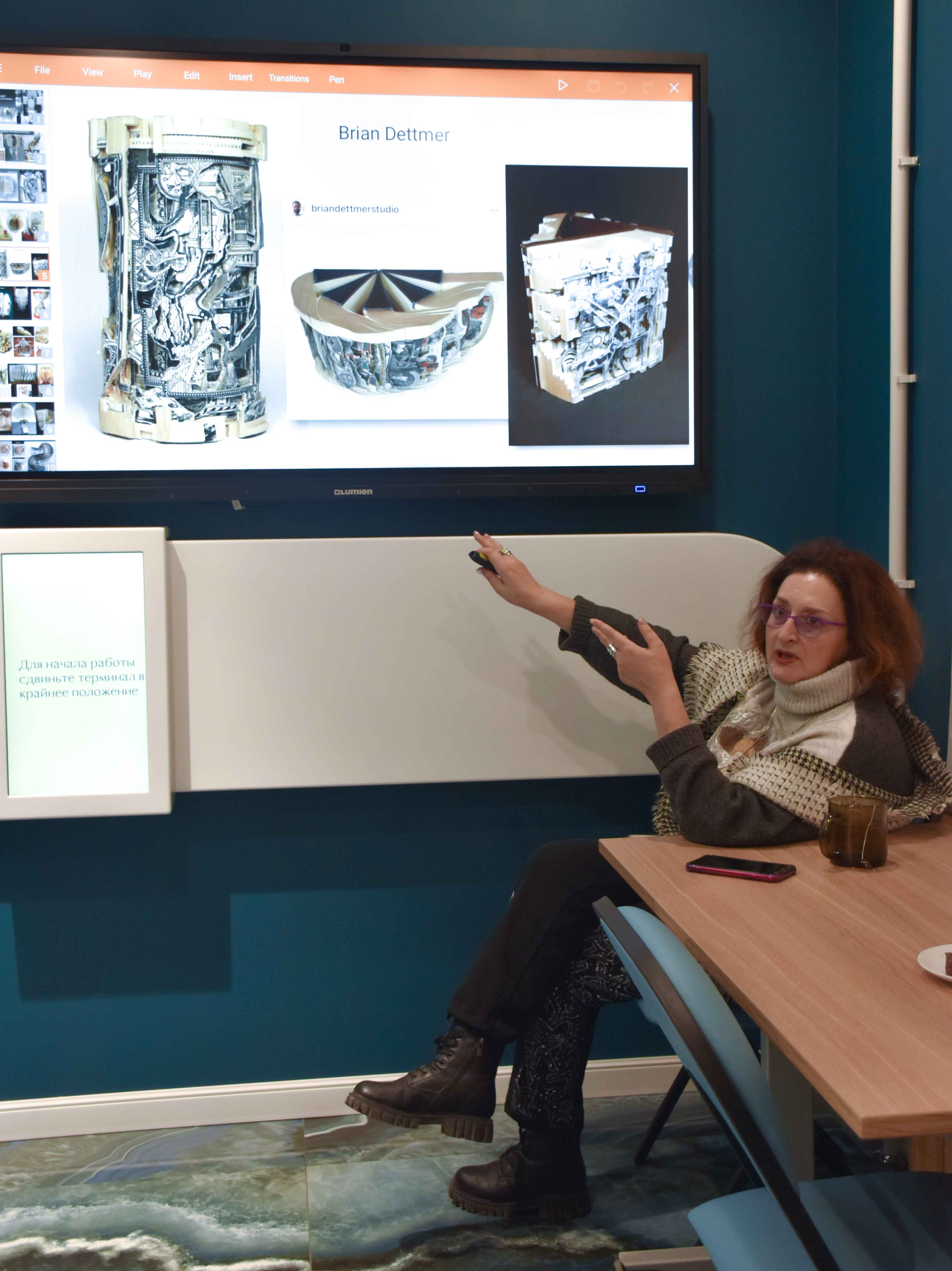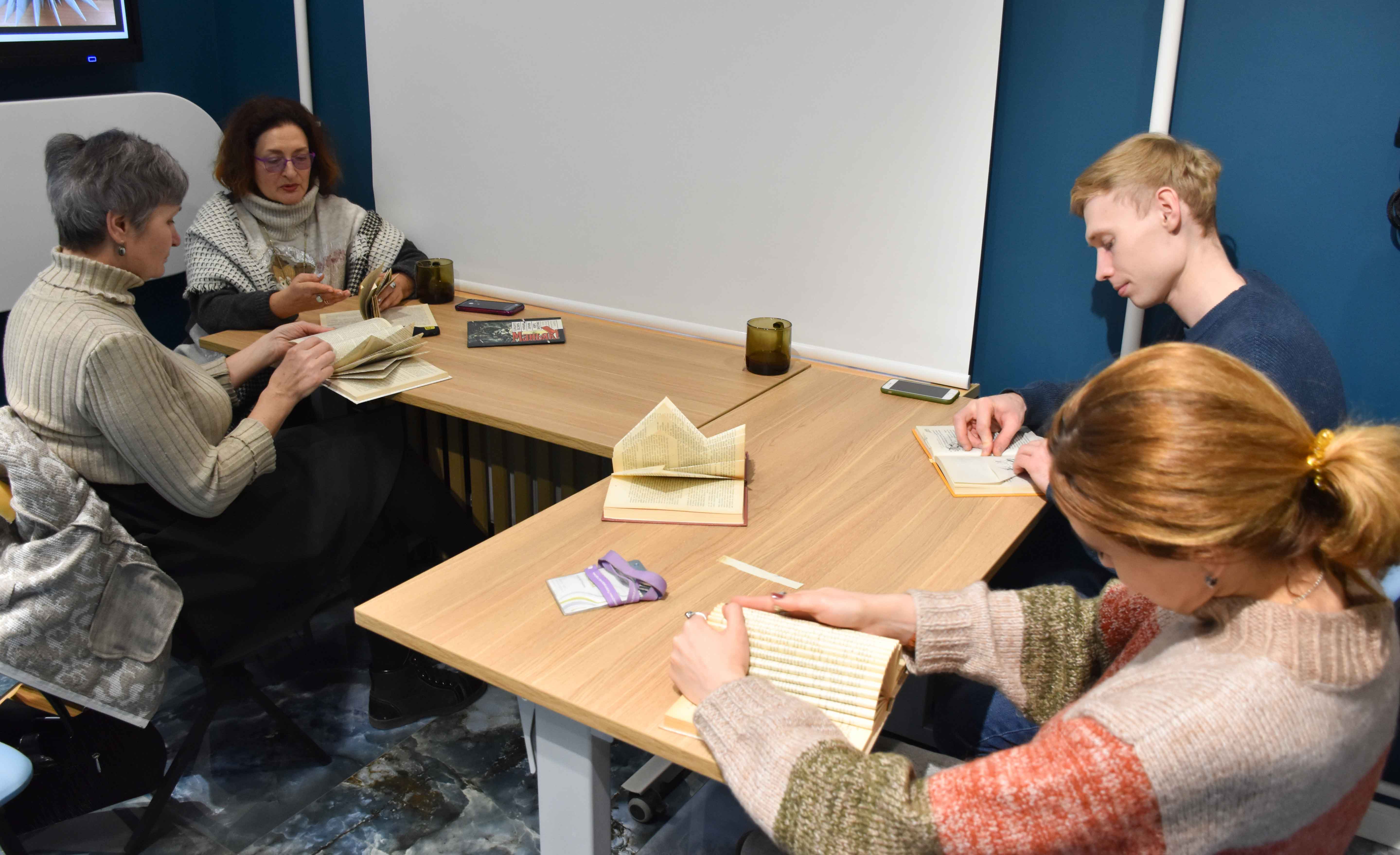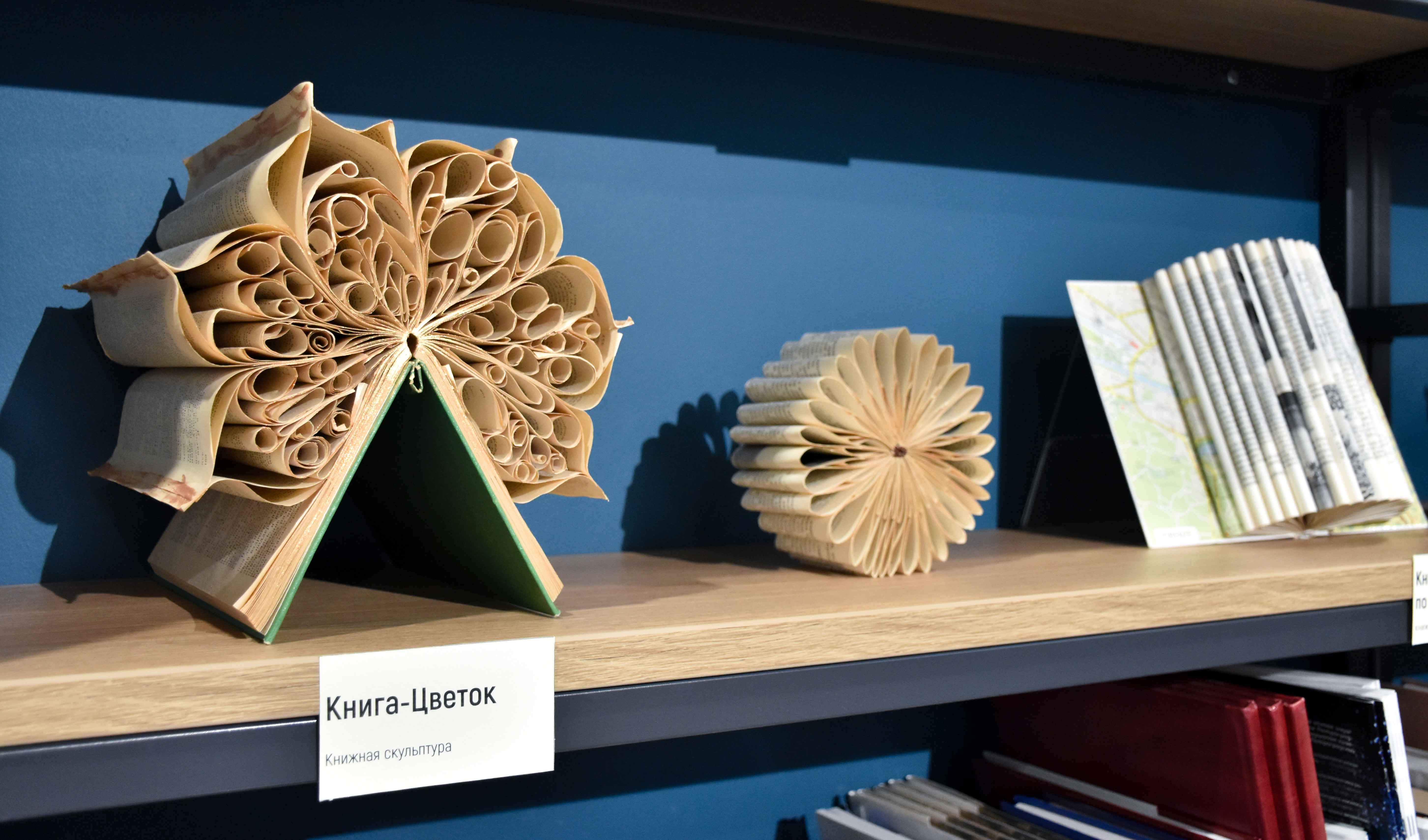 На открытии выставки 7 марта состоялась авторская экскурсия художницы с рассказом о создании ее бук-арт объектов и о разных существующих направлениях этого вида искусства. И, конечно, участники пробовали свои силы в складывании причудливых объектов из книжных страничек.