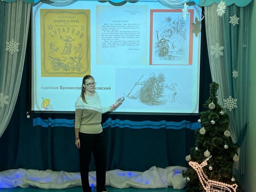 Юные читатели приняли участие в викторине на знание текста повести «Золотой ключик, или Приключения Буратино», посмотрели иллюстрации разных изданий книг. Первое издание было оформлено художником Брониславом Малаховским с чёрно-белыми иллюстрациями. Позднее изображения Буратино и других героев книги были созданы Аминадавом Каневским. В 1943 году он создал серию чёрно-белых иллюстраций, а в 1950 году выполнил цветной вариант акварелью. Последующие издания иллюстрировались известными художниками, такими как Леонид Владимирский, Александр Кошкин, Анатолий Кокорин и Герман Огородников.