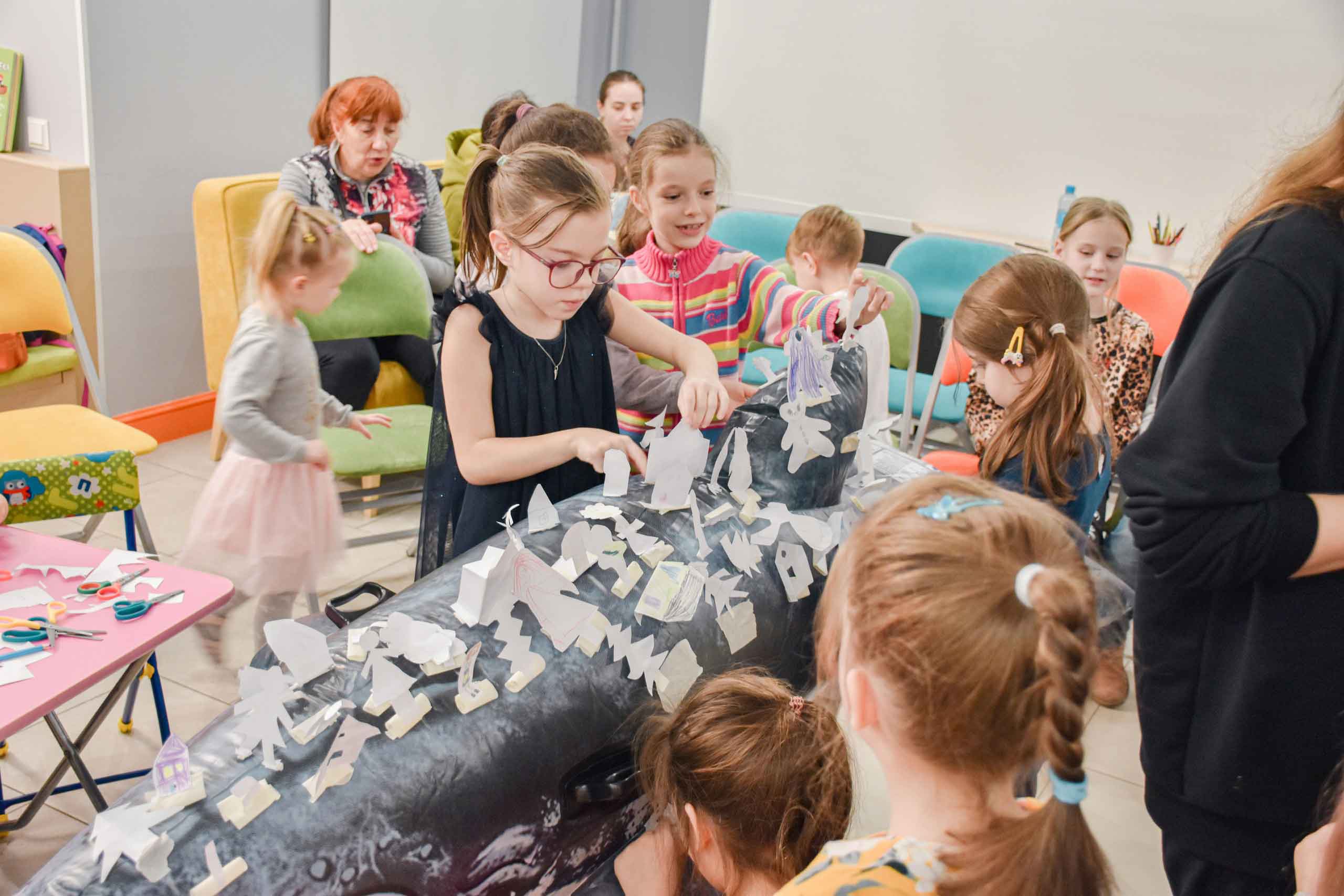 В этот раз к детям и родителям пришла в гости актриса театра Тамара Путрик и принесла с собою куклу-актера - того самого Конька Горбунка, который помогает Ивану в сказке на сцене, и который, кстати, является символом Театра Сказки на Московских воротах. Тамара показала чертеж и схему куклы-мыши и ее детали из прочного папье-маше и дерева. Но центром внимания всей аудитории стал кит, на спине которого буквально за пятнадцать минут была сооружена деревня, посажен лес и поселены разные жители. Дети вокруг мгновенно превратились в море и чаек, а кит поплыл по волнам! В очередной раз все убедились - для того, чтобы оживить сказку, достаточно в нее поверить!