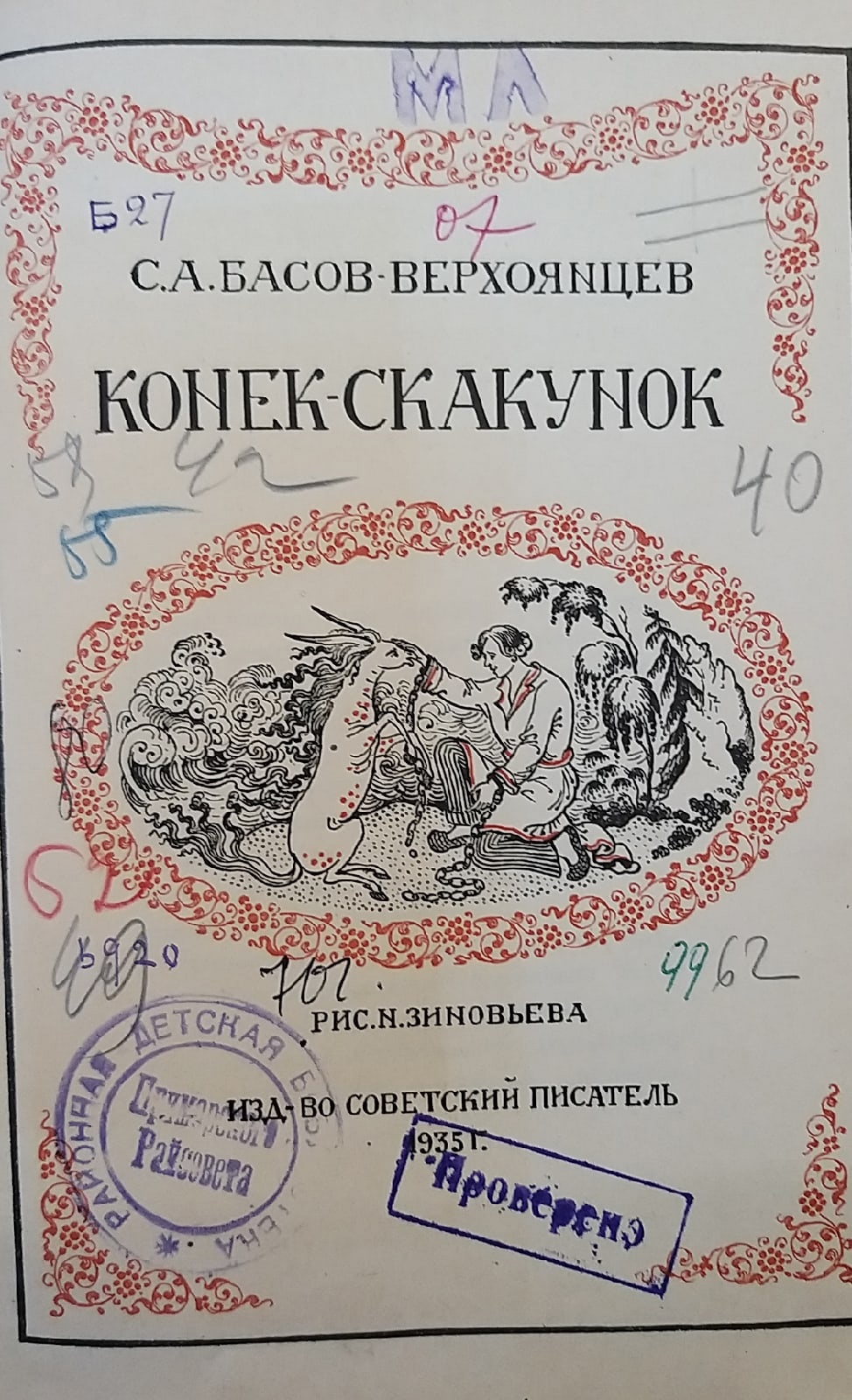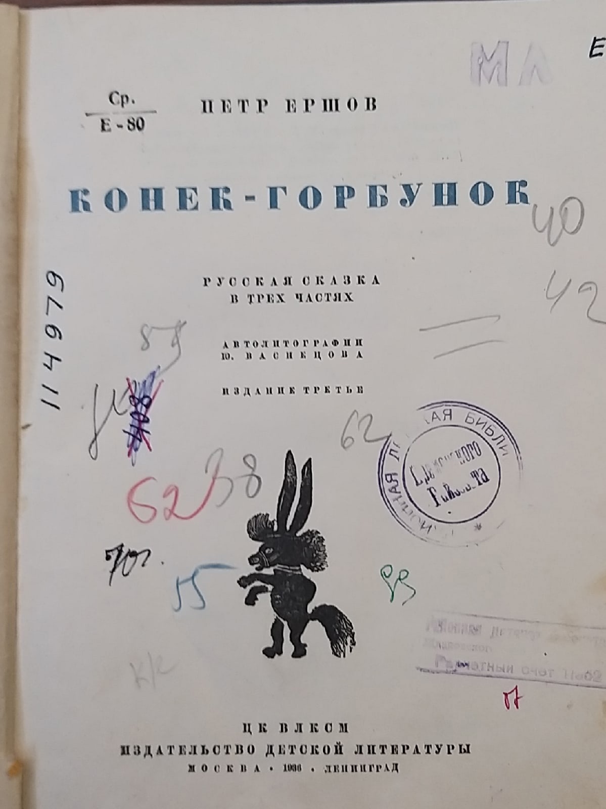 В фонде библиотеки хранится издание 1936 года, выпущенное в издательстве «Детская литература», с автолитографиями художника Юрия Васнецова. Книга выдавалась читателям в период войны и блокады. На титульном листе – отметки о проверках 1940 и 1942 года. Последний раз читатель брал домой это издание в 1985 году. В фонде библиотеки есть также огромное количество современных изданий сказки Ершова.