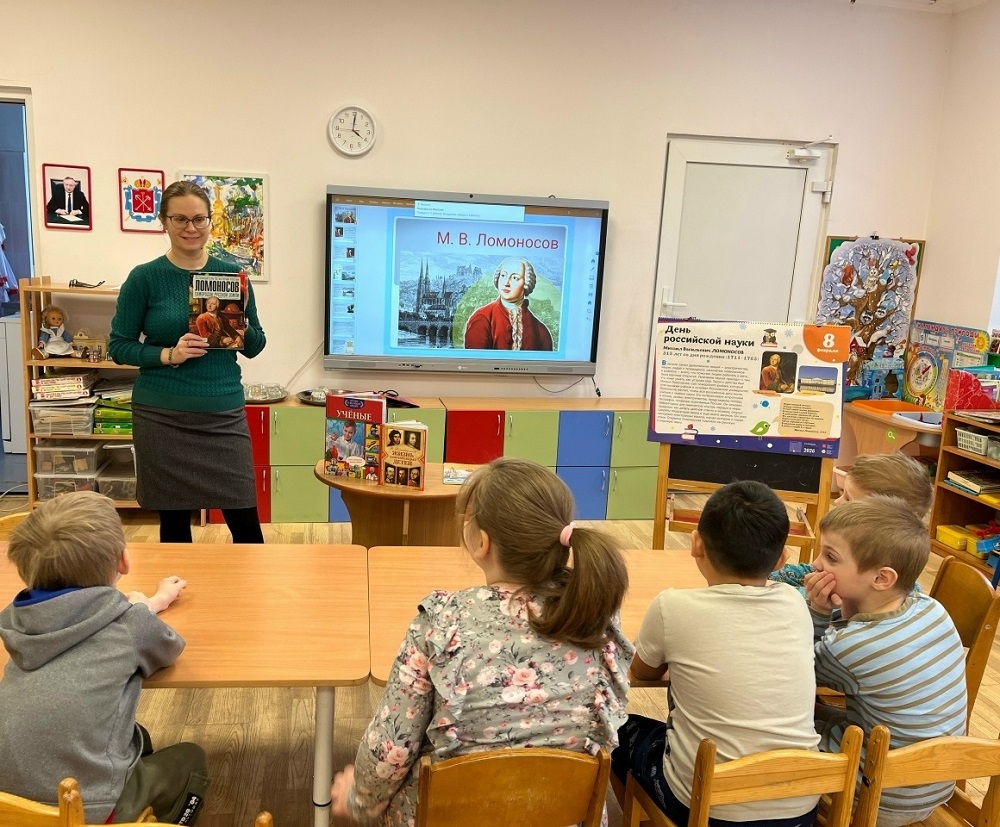 Сотрудник библиотеки посетила воспитанников детского сада № 70 (ул. Грота, д. 2). Встреча была приурочена ко Дню российской науки, который ежегодно отмечается 8 февраля. Библиограф Светлана Нестерова рассказала ребятам о Михаиле Ломоносове — первом русском учёном.
