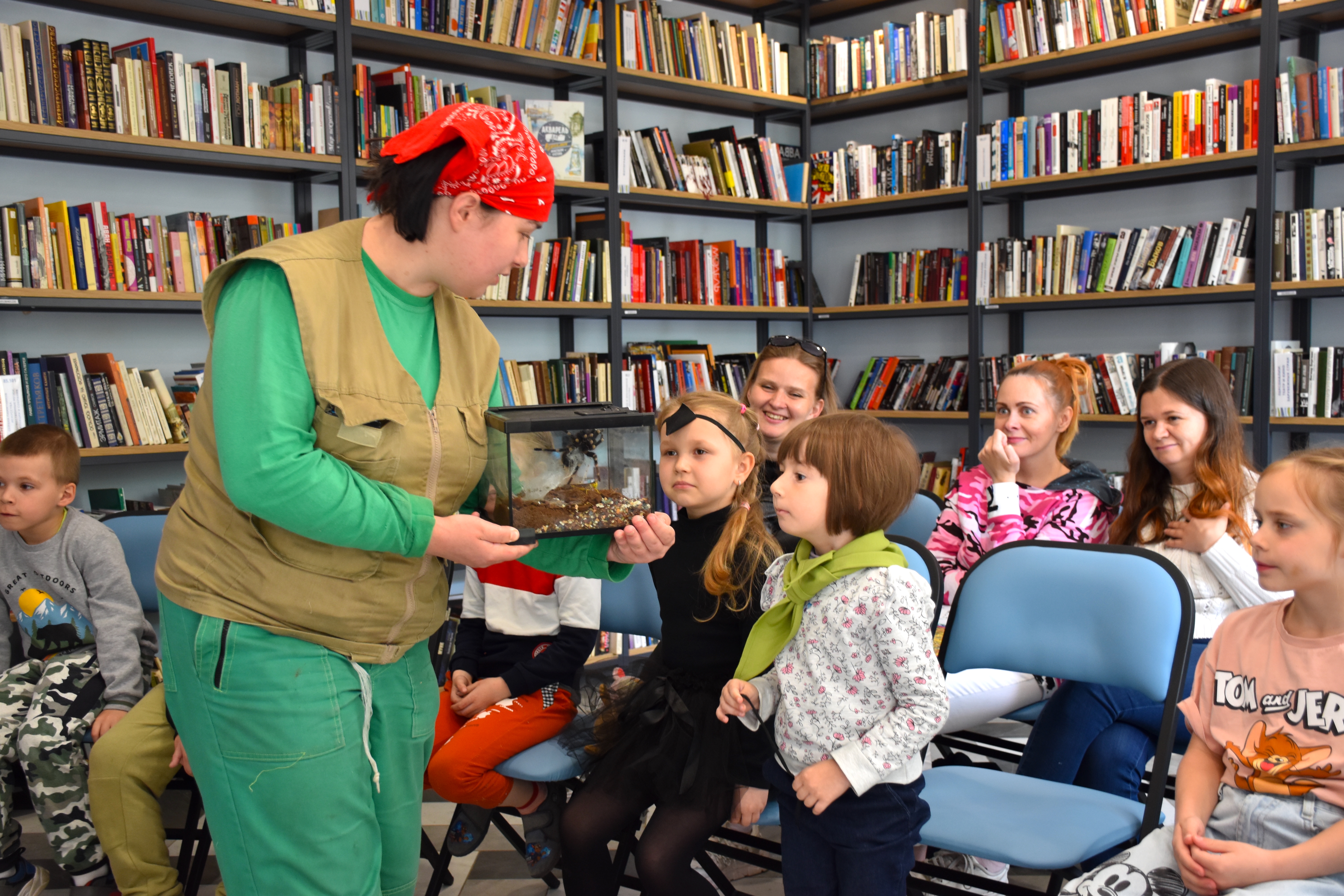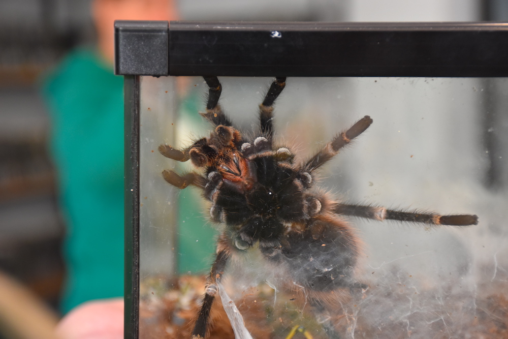 В отдельном тёплом контейнере в библиотеку приехал большой паук! У него в паутине уже надёжно был зафиксирован для обеда вкусный кузнечик. Паук сидел почти неподвижно, и лишь изредка шевелил мохнатыми лапками. Ребята смогли рассмотреть его весьма подробно.