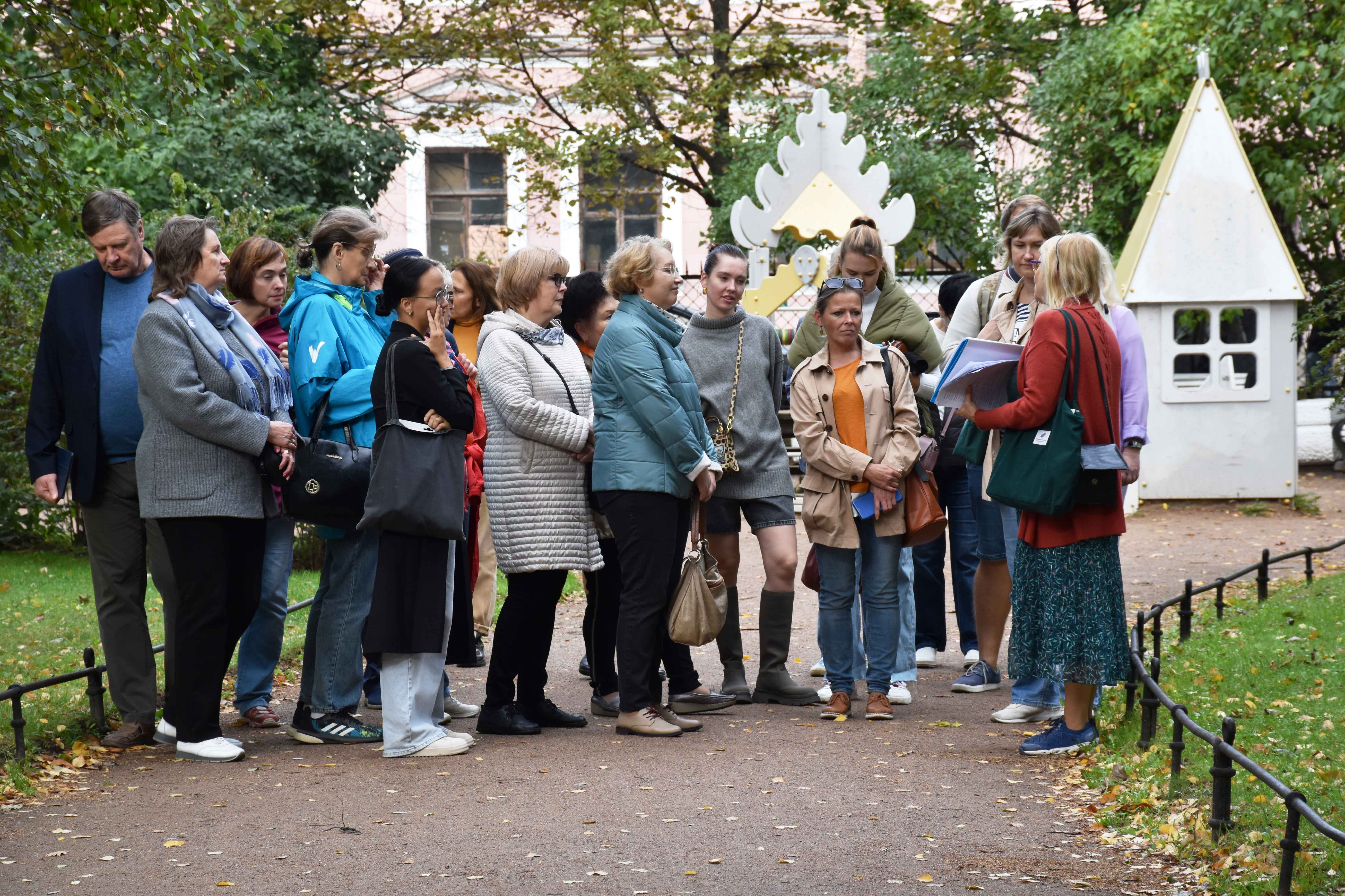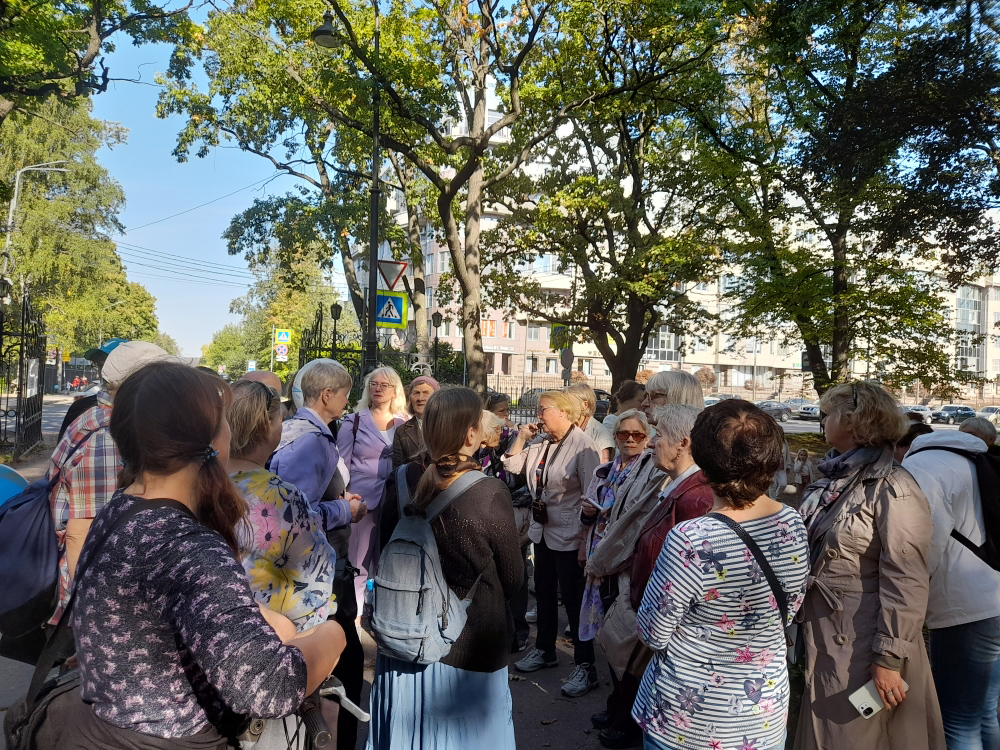 Закончилась экскурсия в Пушкарском саду перед библиотекой имени В.И. Ленина, где когда-то стояла Введенская церковь. Здесь вспомнили историю церкви и приюта. Участники увидели дома, в которых жили художник Борис Кустодиев и академик Иван Павлов.