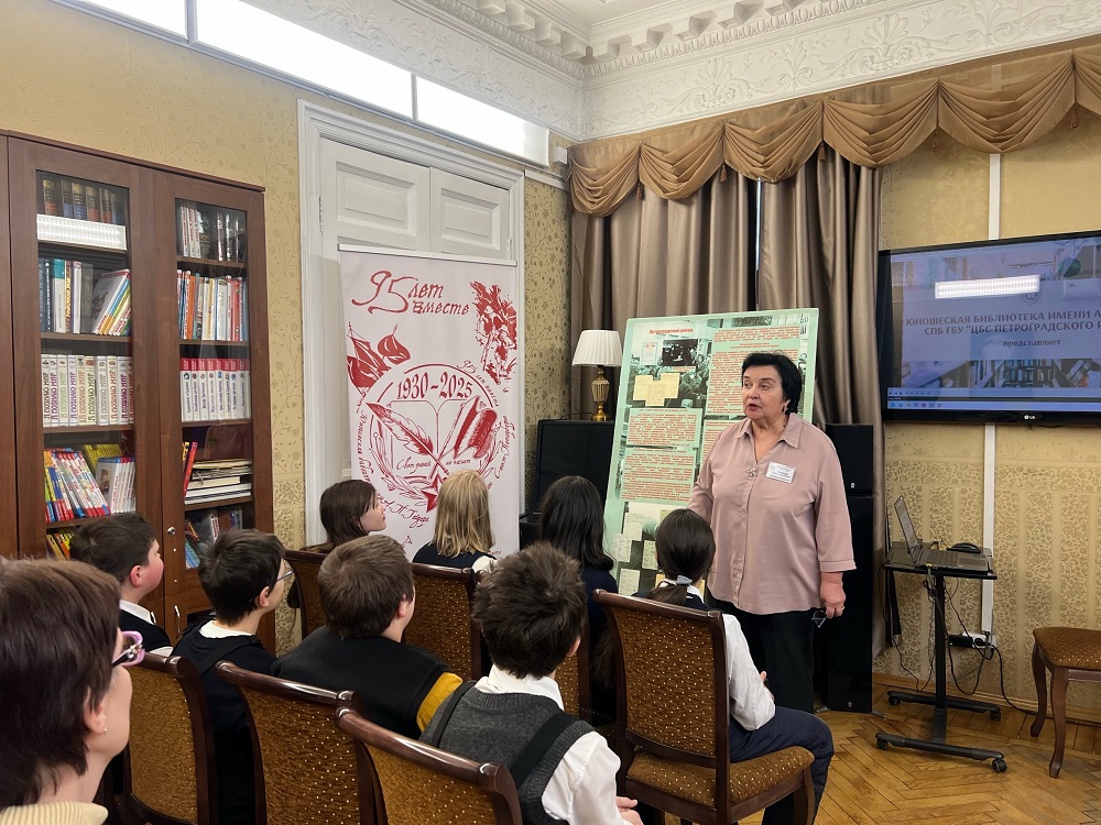 Библиотека, основанная в 1930 году, продолжала работать в годы войны и блокады, сохраняя доступ к книге и знаниям в самых тяжёлых условиях. Гости библиотеки узнали о книгах и журналах, которые выходили в период войны и блокады, о работе театров, музеев и библиотек Петроградского района. Также познакомились с непростой работой школ и детских садов блокадного Ленинграда.