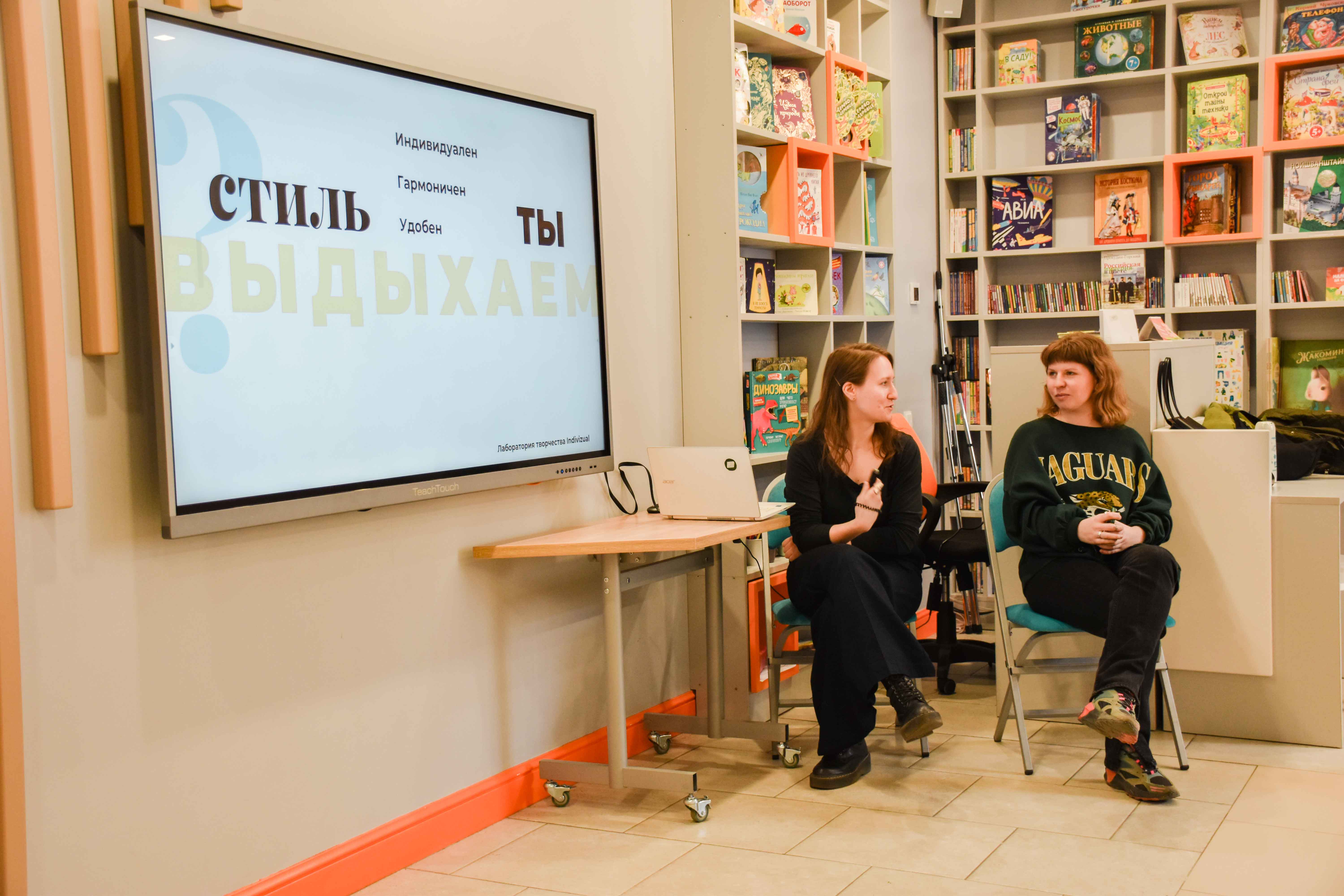 Пока дети мастерили свои экологические книги, подростков и взрослых ждала лекционная программа в медиазале. Первыми выступающими были – петербургский апсайклинг проект «INDIVIZUAL», который специализируется на индивидуальном перешиве ненужных/испорченных вещей. На лекции «Устойчивая мода: мода будущего» спикеры рассказали про быструю и медленную моду, устойчивое развитие коммерческой деятельности и поделились простыми и «модными» шагами к осознанному потреблению, которые доступные каждому из нас.