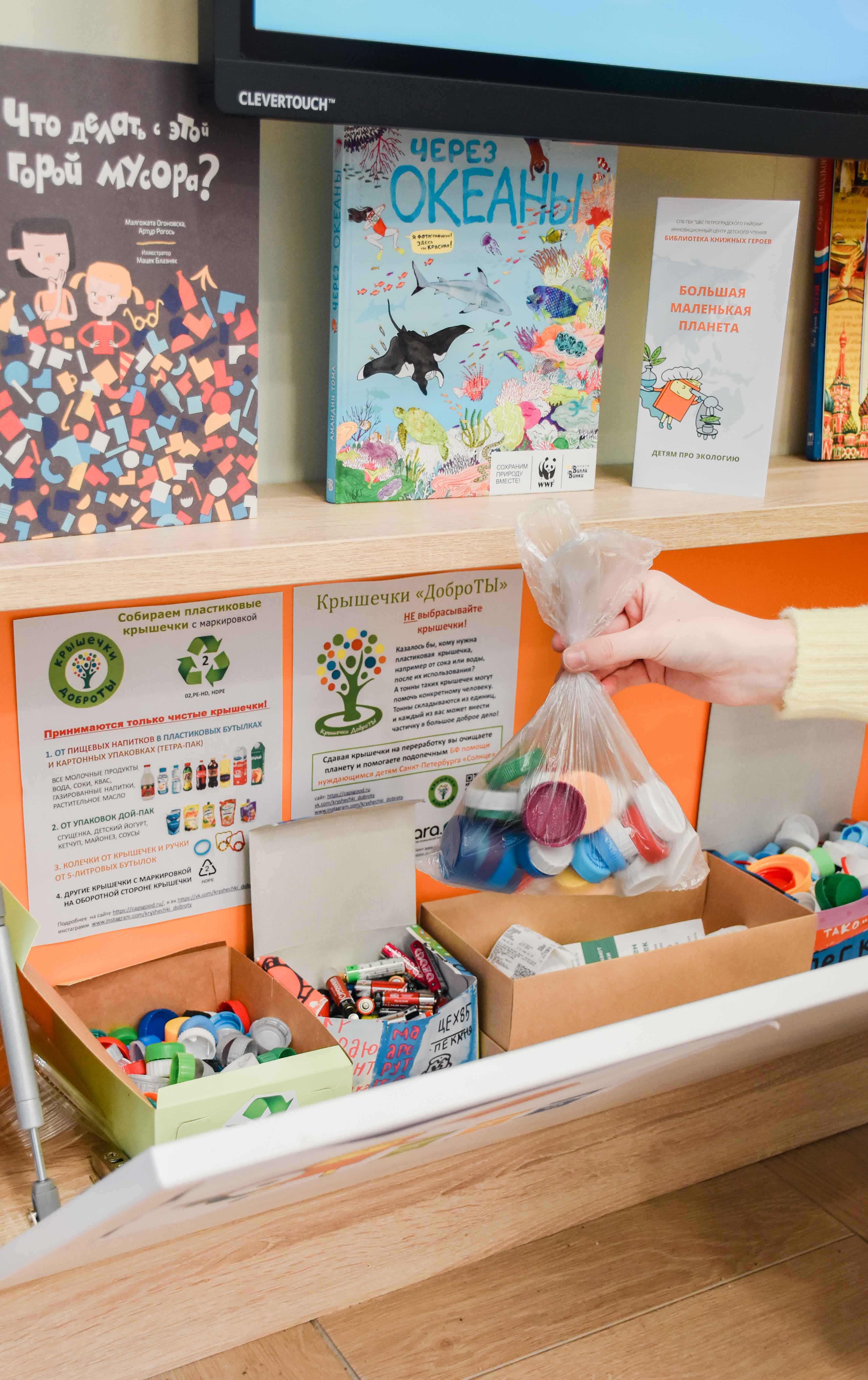 Само пространство Библиотеки книжных героев учит читателей экологии. Сюда можно принести на переработку пластиковые крышечки – библиотека является участником благотворительного экологического проекта Крышечки ДоброТЫ, батарейки и чеки. Библиотека отмечена на карте общероссийского экопроекта "Твоя Вода": для всех читателей установлен кулер с фильтрованной водой, которую можно налить в свою бутылку или попить из многоразового стакана. Сотрудники библиотеки сортируют отходы и сдают пластик, макулатуру и стекло в специальные контейнеры.