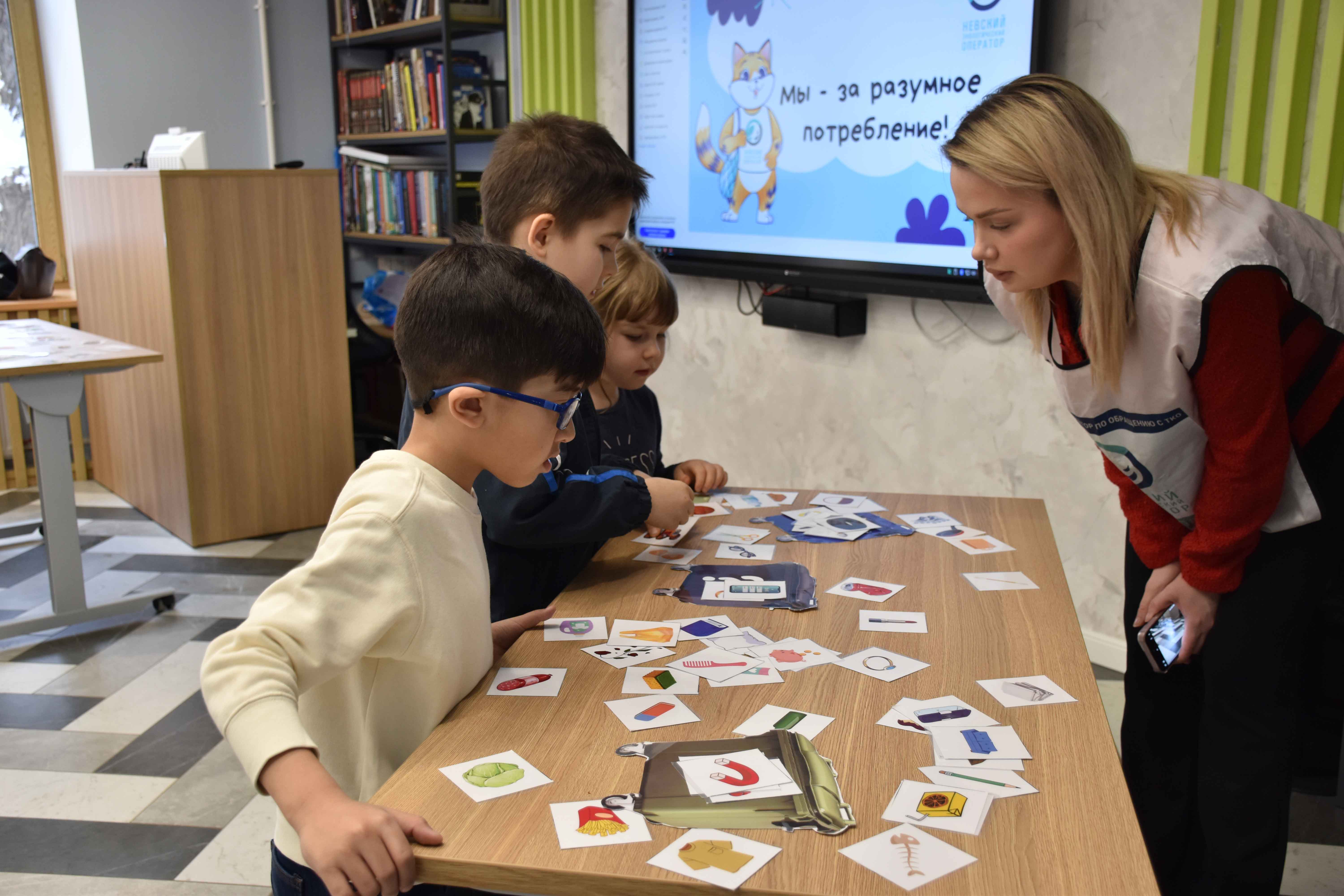 Представитель «Невского экологического оператора» Екатерина Матвеева рассказала о важности сортировки мусора, и в игровой форме маленькие участники попробовали разобраться с «мусорной» корзиной.