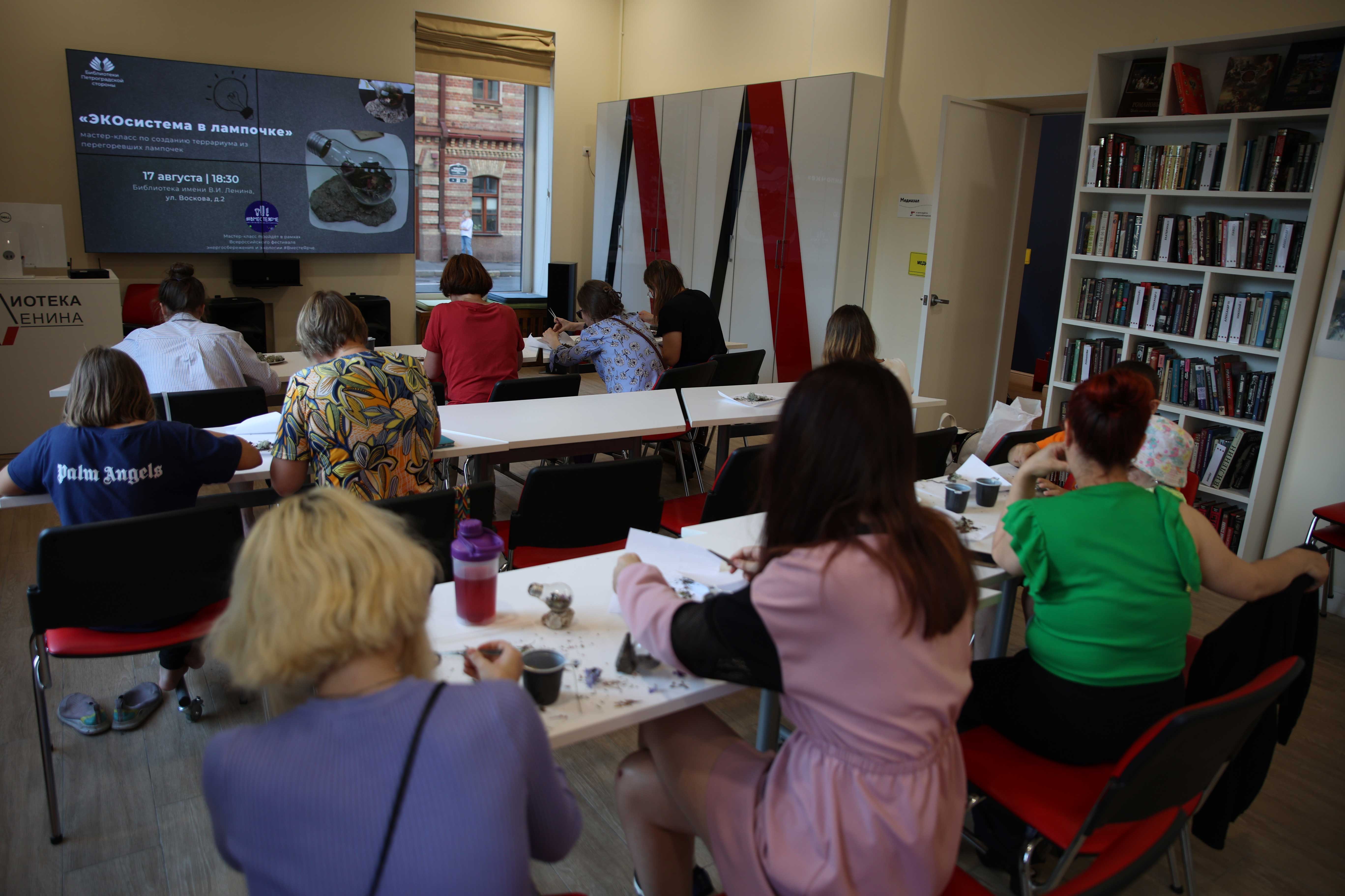 Библиотеки Петроградской стороны ежегодно присоединяются к Всероссийскому движению #ВместеЯрче. На мастер-классе «ЭКОсистема в лампочке» ведущие рассказали и показали, как простой перегоревшей лампочке можно дать вторую жизнь, сделав из неё стильный и современный элемент декора. 12 участников сделали уникальный дизайн своего собственного террариума с природными материалами.