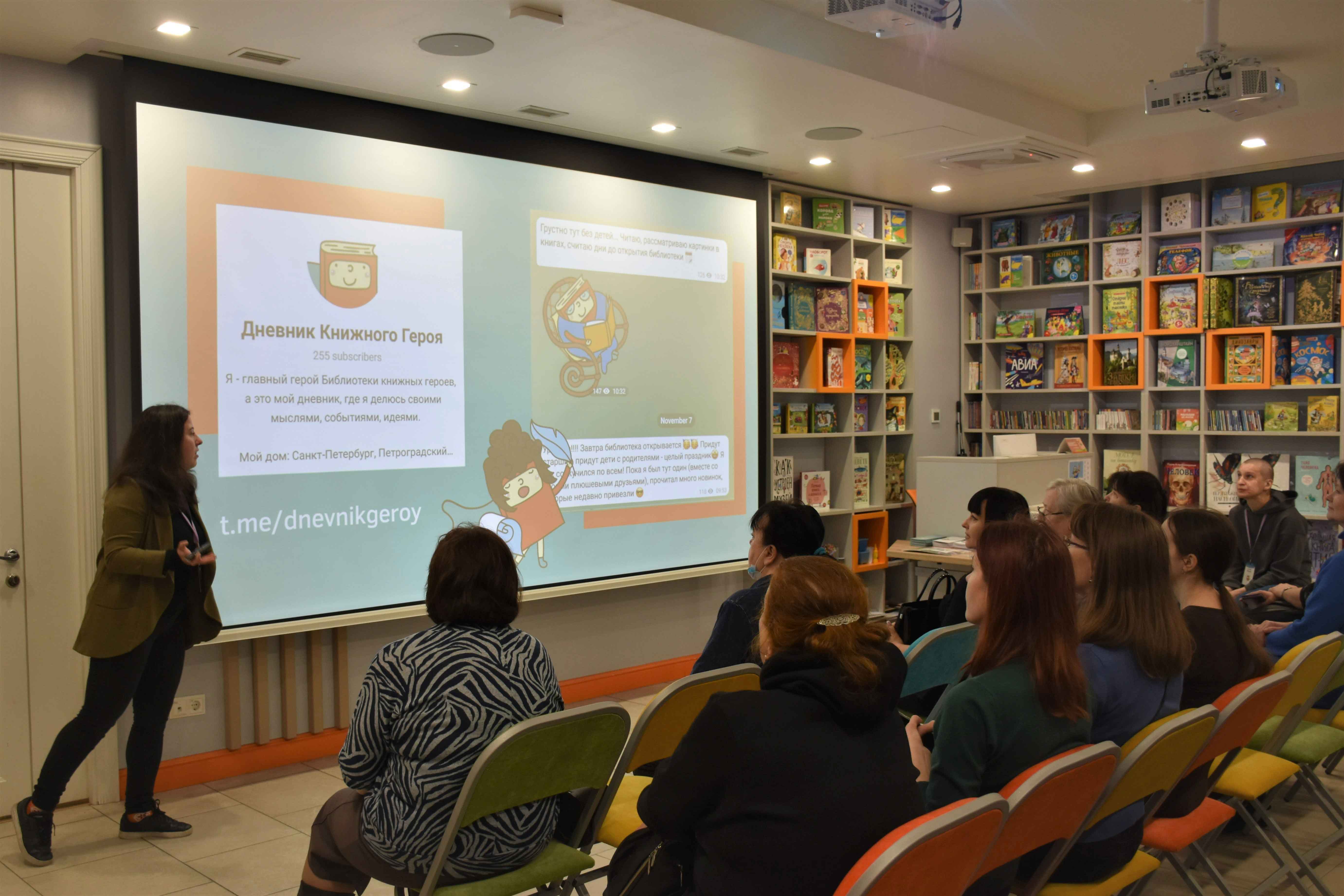 Библиограф Татьяна Шулаева рассказала гостям о многочисленных проектах библиотеки и поделилась опытом их реализации. Большой отклик получил проект, посвящённый проблемам травли в детских и подростковых коллективах, «Я не верю в монстров». Участникам встречи также были представлены библиографические пособия библиотеки: буклеты с тематическими подборками книг и рекомендательные списки литературы, доступные для свободного скачивания в разделе «Профессионалам» на сайте Библиотек Петроградской стороны.
