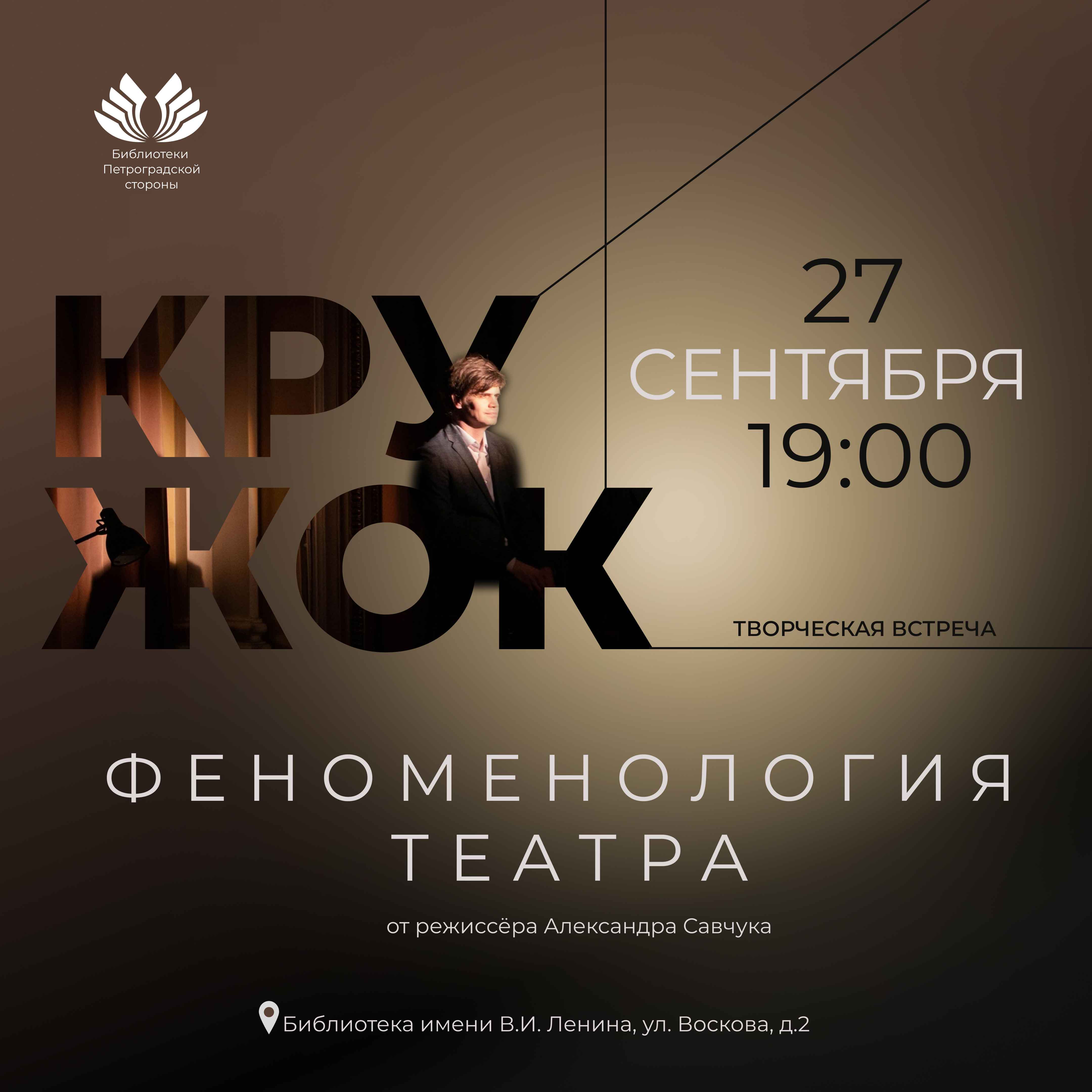 27 сентября в Библиотеке имени В.И. Ленина пройдет творческая встреча «Кружок: Феноменология театра». Встречу проведёт Александр Савчук – режиссёр, актёр, перформер, руководитель театра «LUSORES», куратор Лаборатории Нового Театра, педагог центра «Инклюзион».
