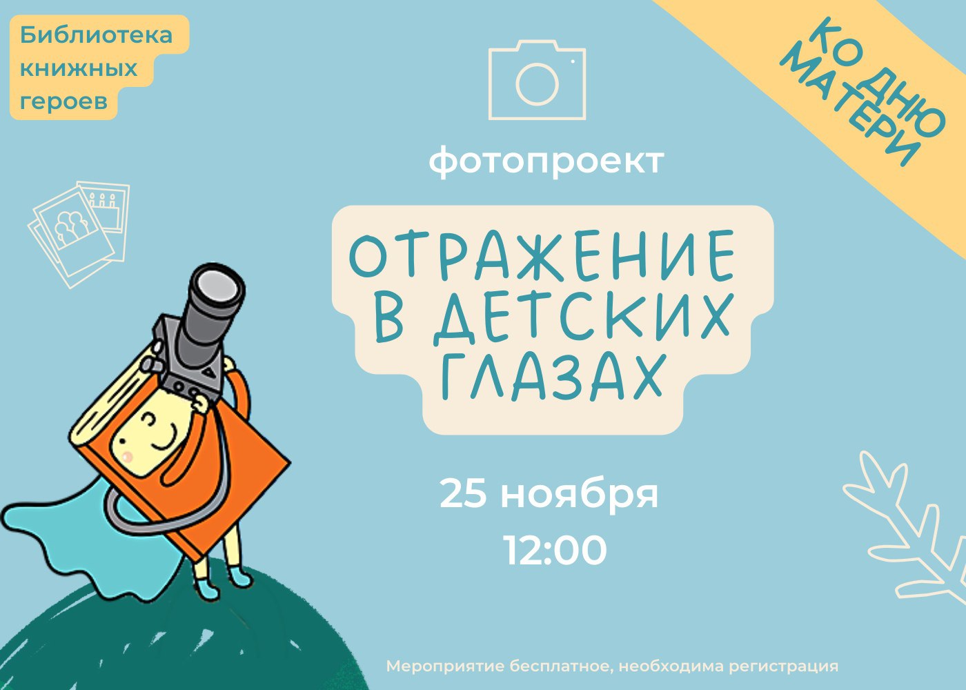 В Библиотеке книжных героев 25 ноября пройдет фотопроект «Отражение в детских глазах», посвященный Дню матери. Главная идея фотопроекта - запечатлеть не только радости семейной жизни, но и показать индивидуальную красоту каждой мамы.