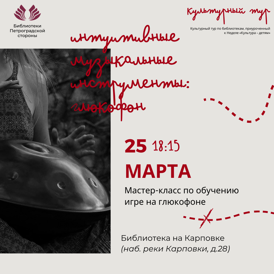 25 марта в 18:15 в Библиотеке на Карповке (наб. реки Карповки, д.28) пройдёт мастер-класс по обучению игре на глюкофоне.