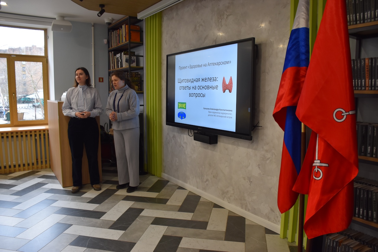 11 марта в Библиотеке на Карповке (наб. р. Карповки, д. 28) прошла встреча с врачом-ординатором эндокринологом Хальзовой Александрой Константиновной на тему «Щитовидная железа: ответы на основные вопросы». Лекция организована муниципальным образованием «Аптекарский» и прошла в рамках проекта «Здоровье на Аптекарском».