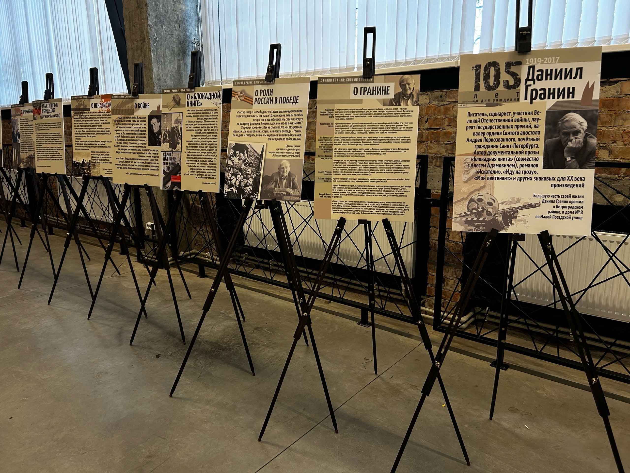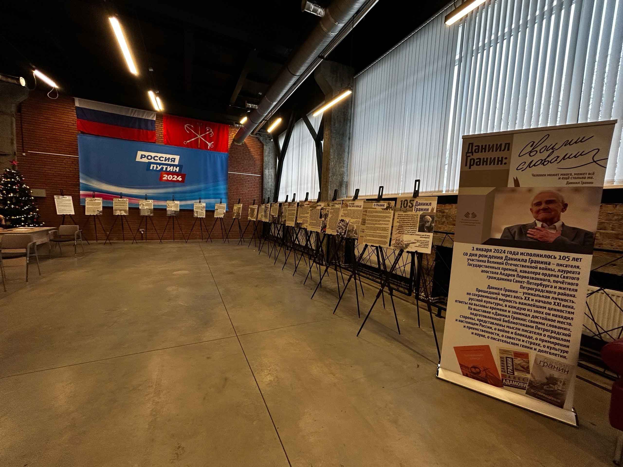 С 17 по 19 января в Санкт-Петербургском региональном избирательном штабе кандидата в президенты РФ Владимира Путина в пространстве «Артплей» на Красногвардейской площади демонстрировалась выставка «Даниил Гранин: своими словами», посвященная 105-летию со дня рождения писателя. Материалы выставки подготовлены Библиотеками Петроградской стороны.