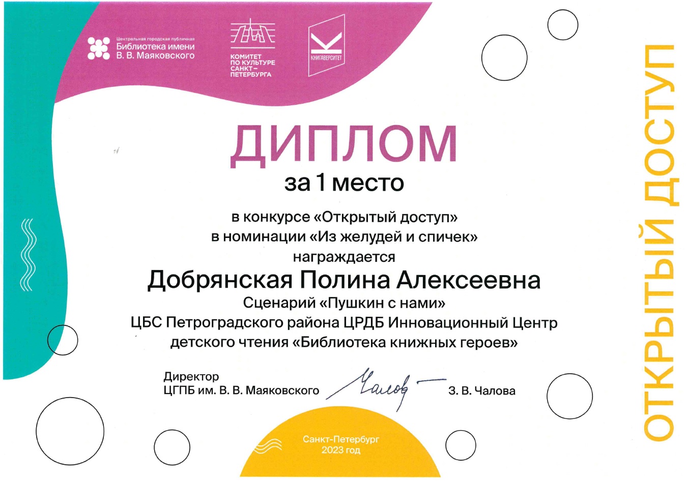 В конкурсе сценариев «Открытый доступ» победителем стала Библиотека книжных героев. Диплом за 1 место в номинации «Из желудей и спичек» получила Добрянская Полина со сценарием «Пушкин с нами».
