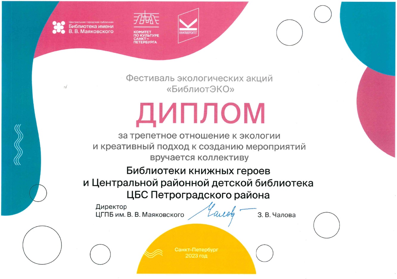 Дипломом за трепетное отношение к экологии и креативный подход к созданию мероприятий отмечен коллектив Центральной районной деткой библиотеки и Библиотеки книжных героев.