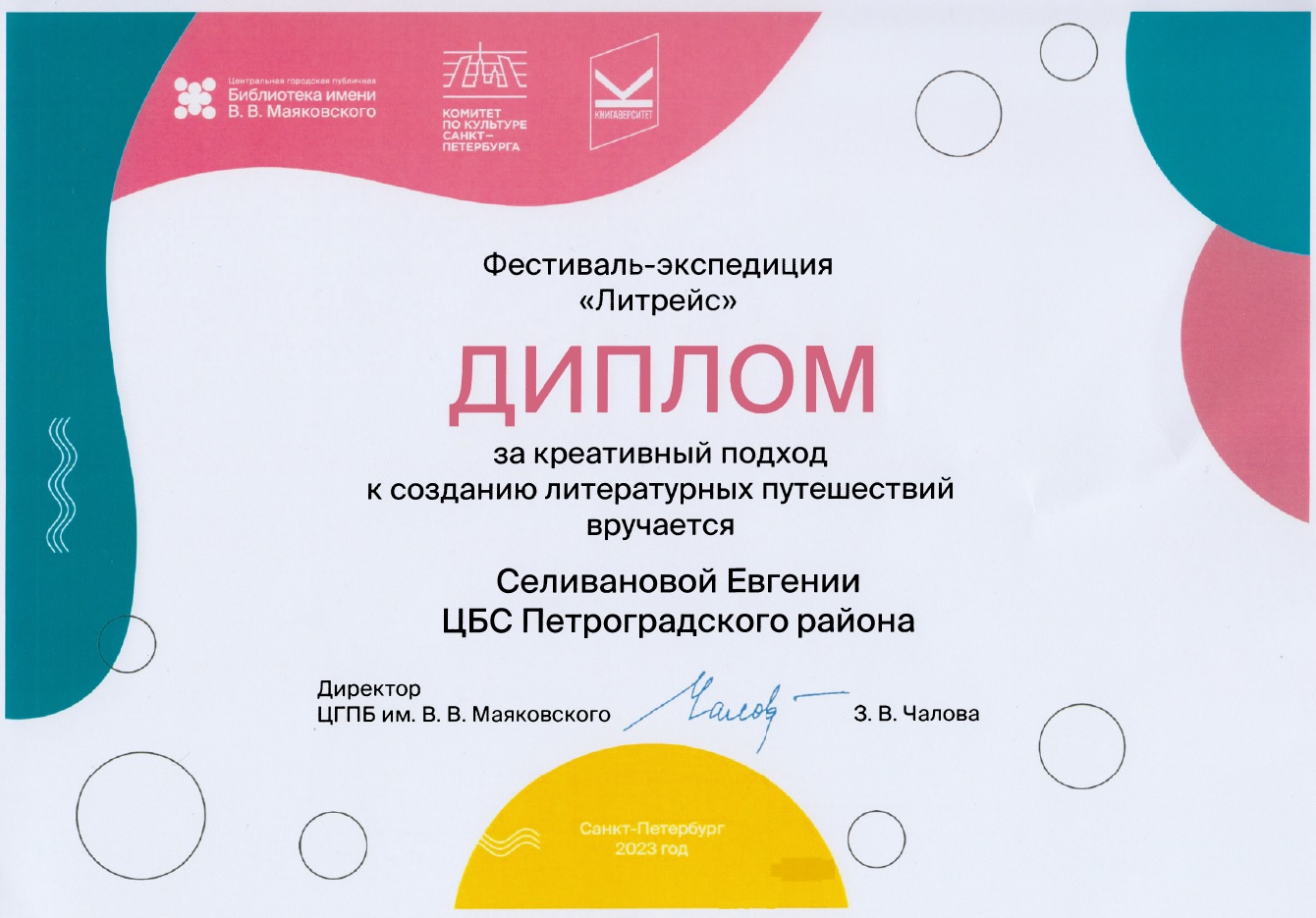 Дипломом за креативный подход к созданию литературных путешествий фестиваля- экспедиции «Литрейс» отмечен маршрут Селивановой Евгении (Библиотека на Карповке).