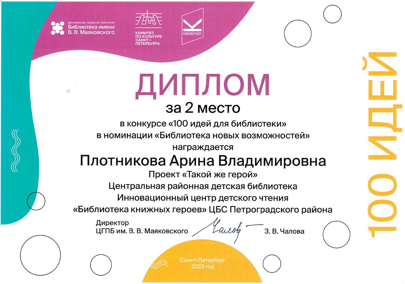 В конкурсе «100 идей для библиотеки» 2-е место заняла Библиотека книжных героев — в номинации «Библиотека новых возможностей» с проектом «Такой же герой» дипломом награждена Плотникова Арина.