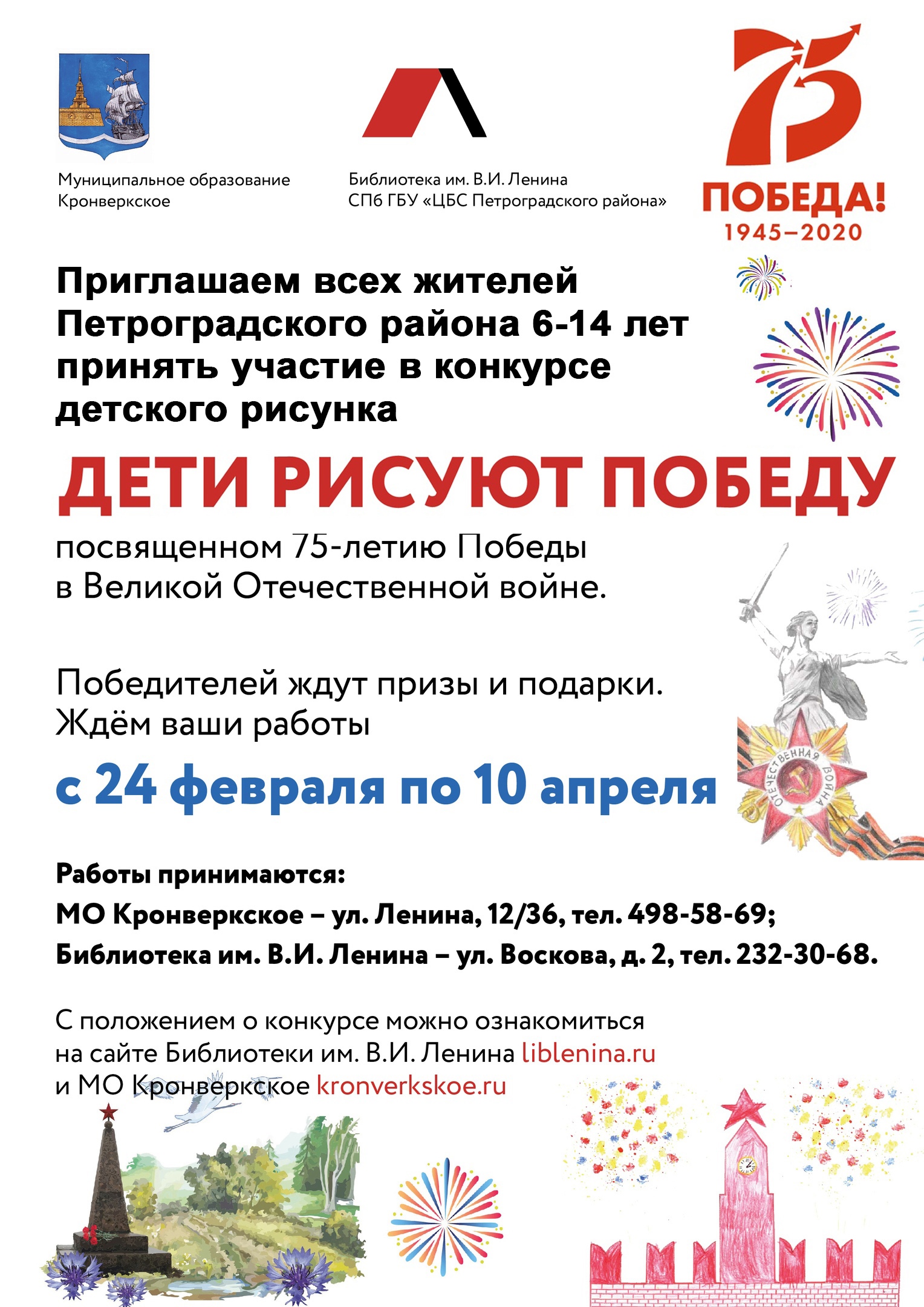 МО Кронверкское совместно с Библиотекой Ленина приглашают принять участие в конкурсе детского рисунка "Дети рисуют Победу!"