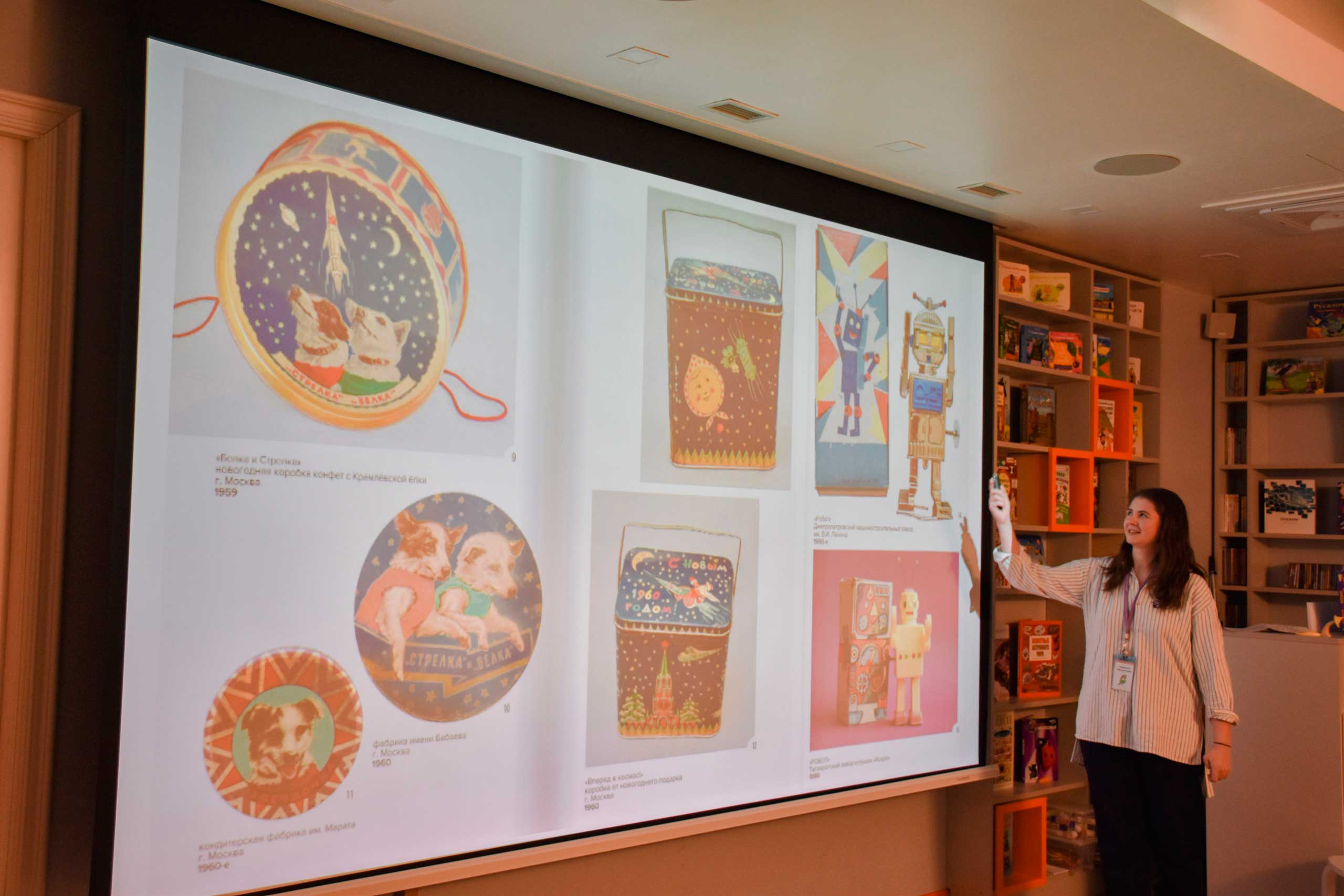 Космическая программа коснулась разных областей искусства СССР: графики, живописи, скульптуры, архитектуры, а также дизайна. Дизайн многих предметов того времени сохранил память о великих космических открытиях. На занятии ребята рассматривали вещи той эпохи, оказалось, что некоторые из них до сих пор хранятся в их семьях, например, старый холодильник или ёлочная игрушка с космическими орнаментами.