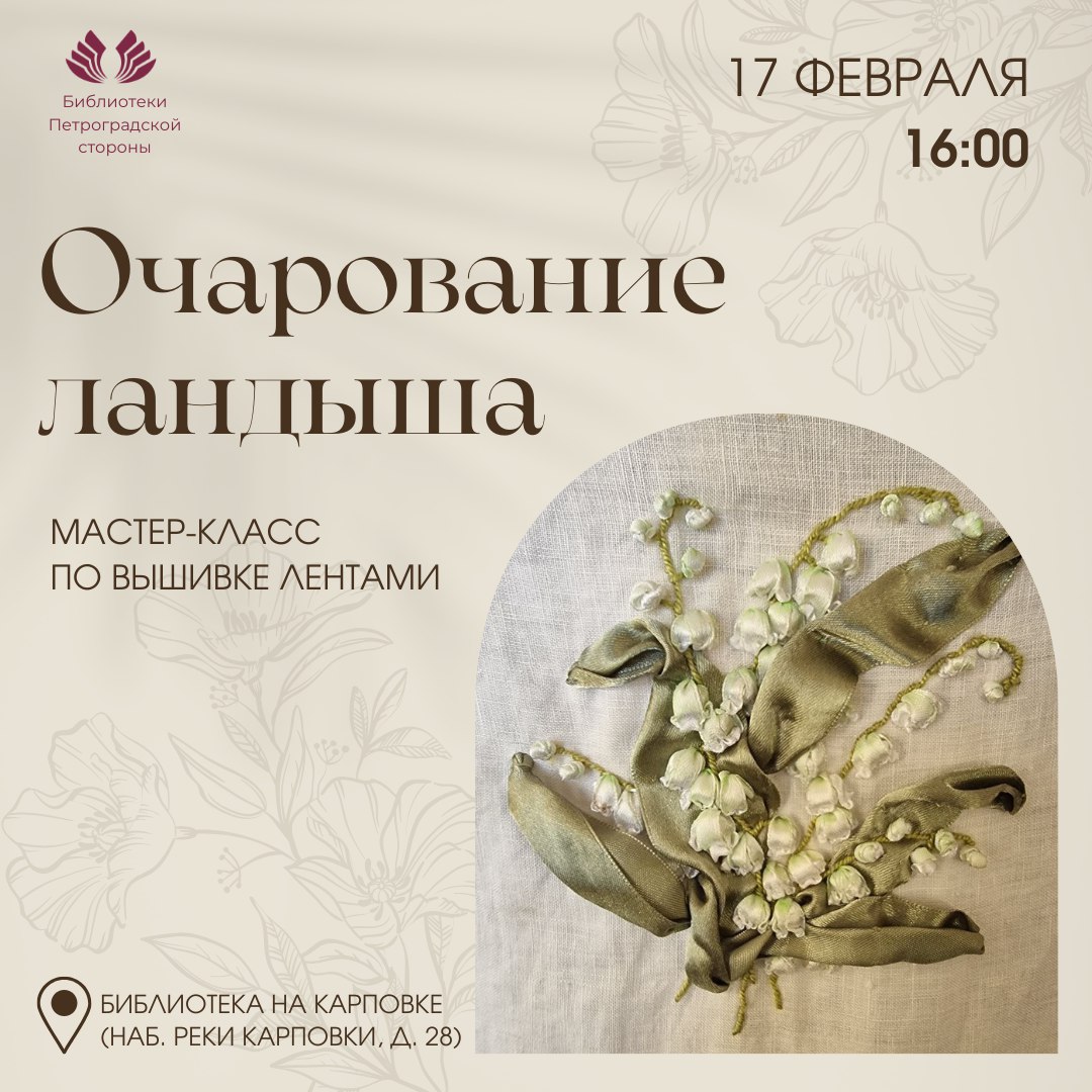 17 февраля в 16:00 в Библиотеке на Карповке (наб. р.Карповки, д.28) состоится мастер-классе по вышивке лентами "Очарование ландыша".