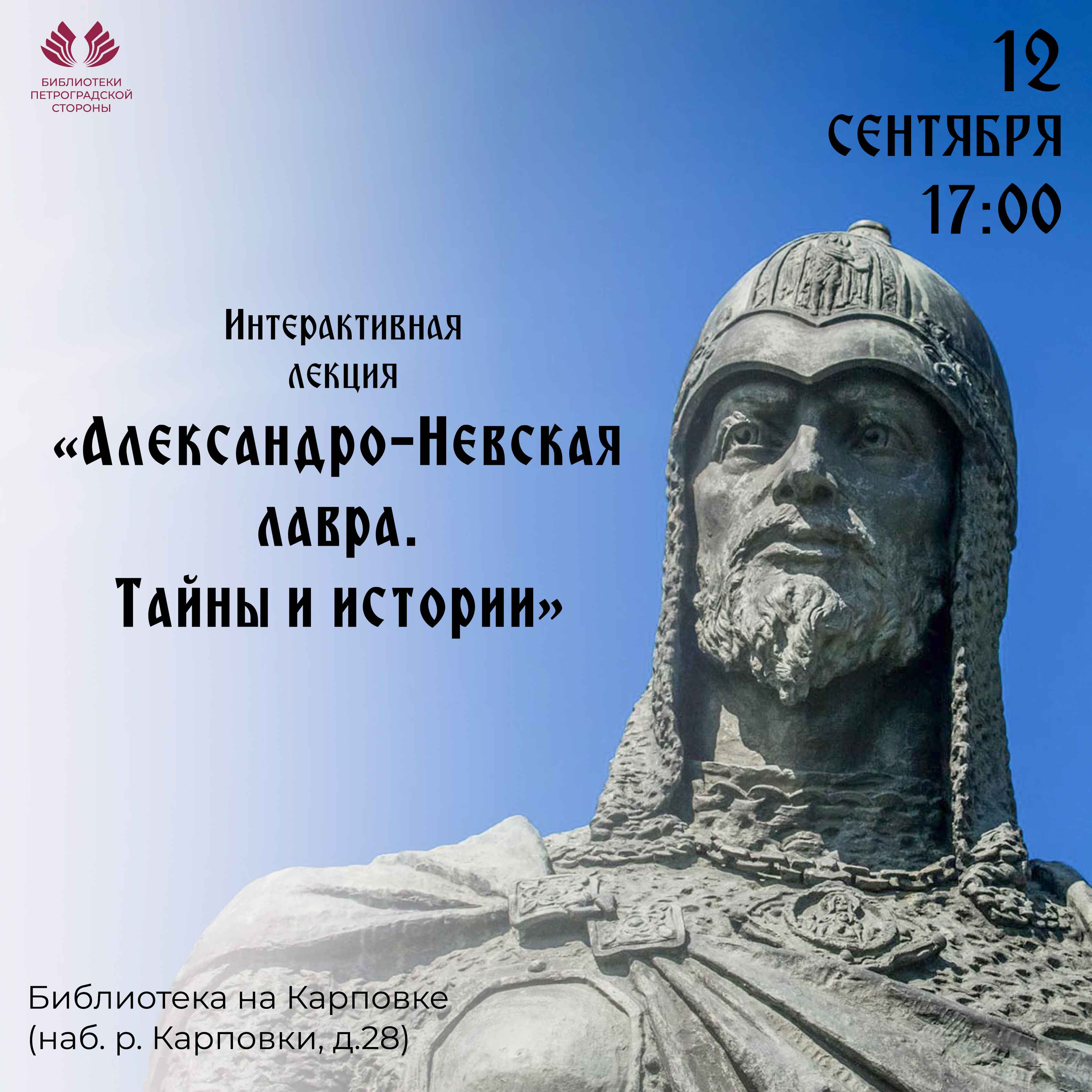 В этом году Свято-Троицкая Александро-Невская лавра отмечает 300-летие со дня перенесения в Санкт-Петербург из Владимира мощей святого благоверного князя Александра Невского – небесного покровителя города. Реликвию в город на Неве торжественно доставили 12 сентября 1724 года по приказу Петра I. В день общегородского и церковного праздника Библиотека на Карповке приглашает всех увлечённых прошлым и настоящим Санкт-Петербурга на интерактивную лекцию «Александро-Невская лавра. Тайны и истории».