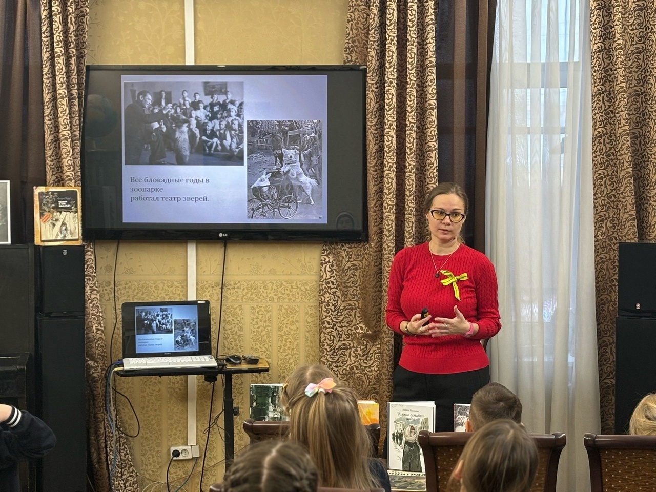 Ребята узнали о работе библиотек, театров, кинотеатров и Ленинградского зоопарка. Посетили выставку архивных документов «История небольшой районной библиотеки Санкт-Петербурга в годы войны и блокады». Ребята узнали, что во время войны и блокады библиотека имени А.П. Гайдара не прекращала работать для читателей, пополнялись новыми книгами фонды. Больше всего детей удивили книжные формуляры изданий, которые поступили в фонд библиотеки в 1941 и 1942 году. Книги — совсем ветхие, с пожелтевшими страницами — выдавались много раз. На титульных листах сохранились пометки блокадного времени. Мы полистали библиотечную книгу Д. Мамина-Сибиряка «Алёнушкины сказки» 1941 года издания.
