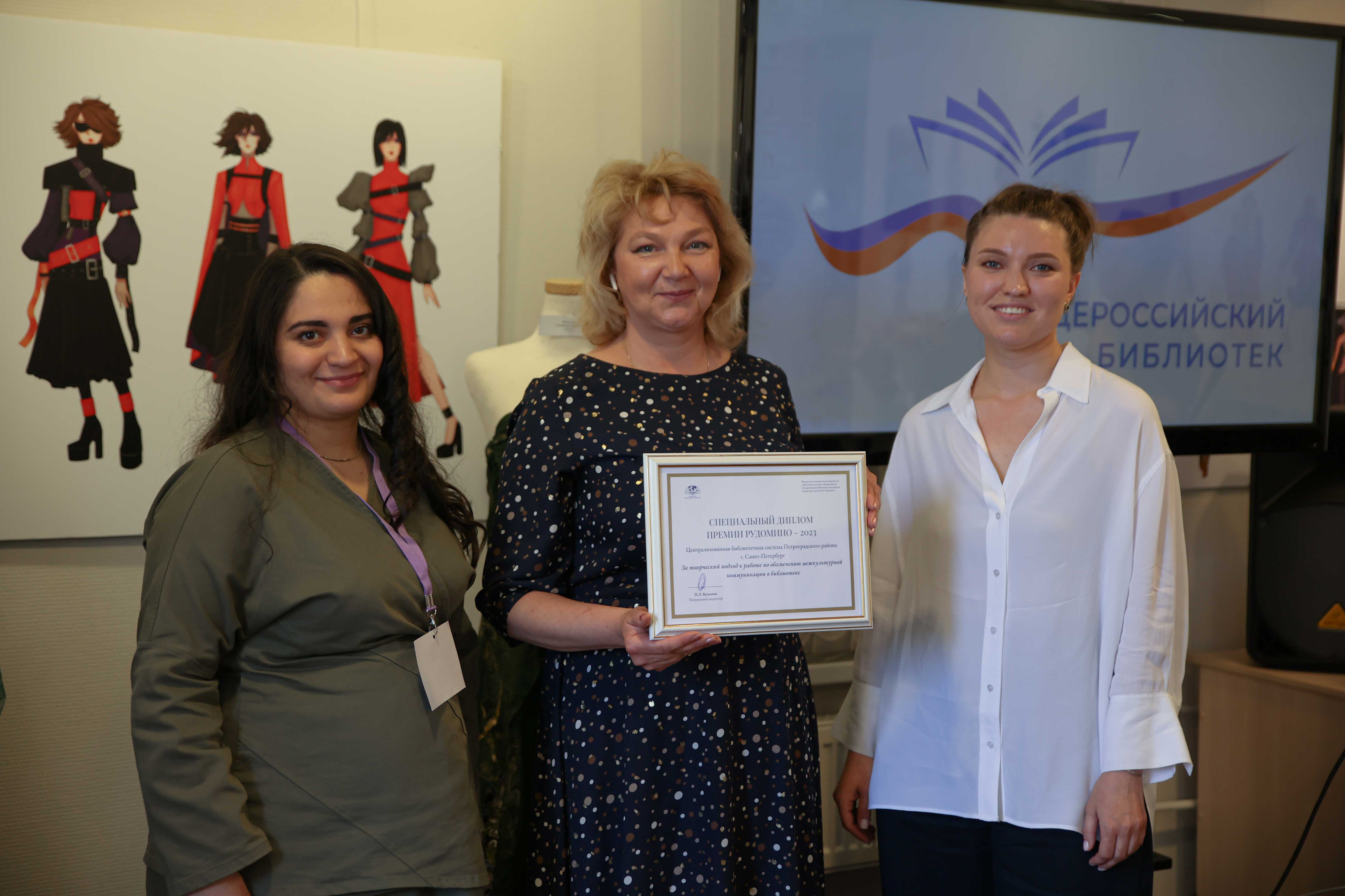 Гертруда Михайловна Атаманова вручила коллективу методического отдела и библиотеки на Кронверкском специальный диплом «За творческий подход к работе по обеспечению межкультурной коммуникации в библиотеке» за реализацию проекта "Арт-лаборатория «Изменить мир».
