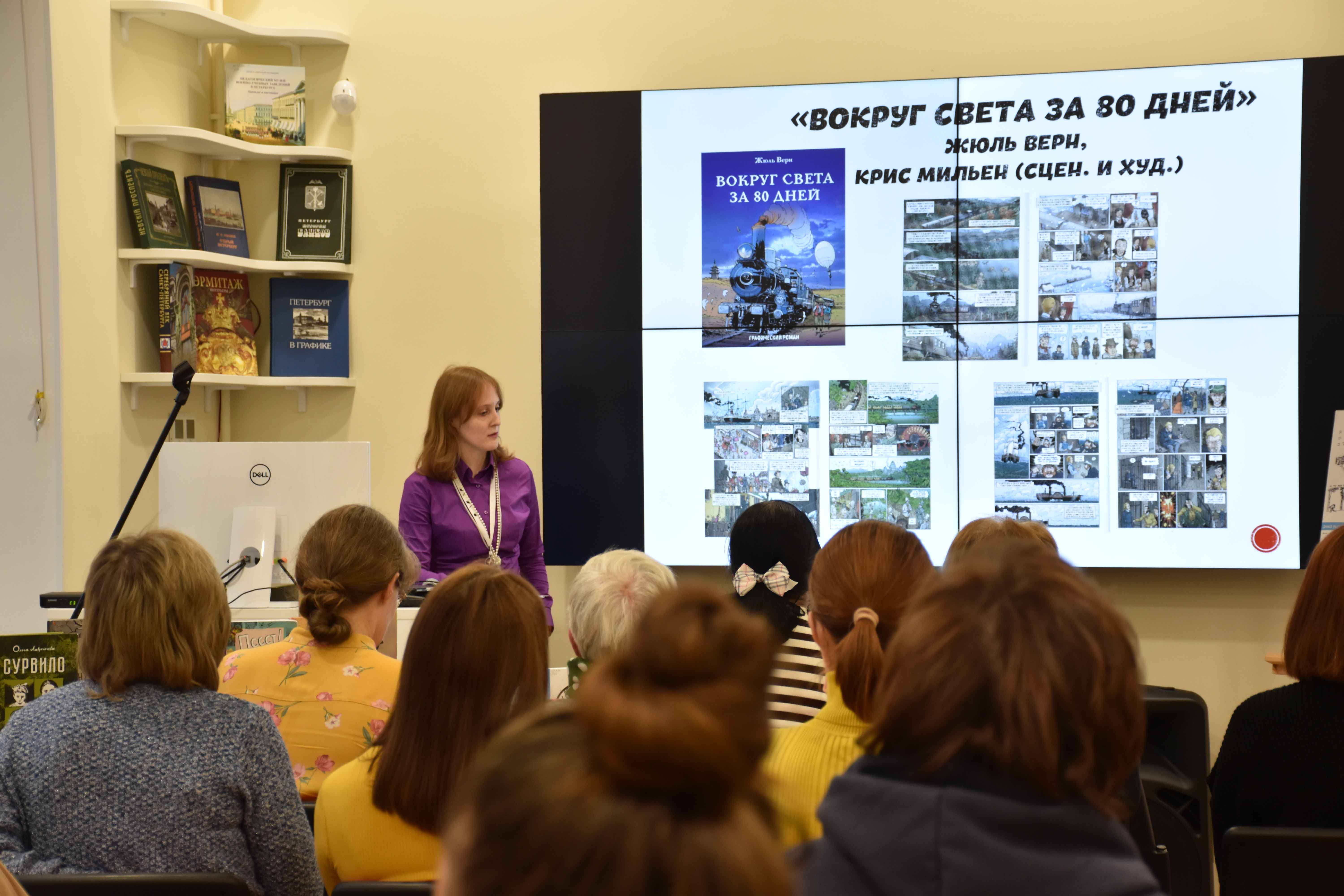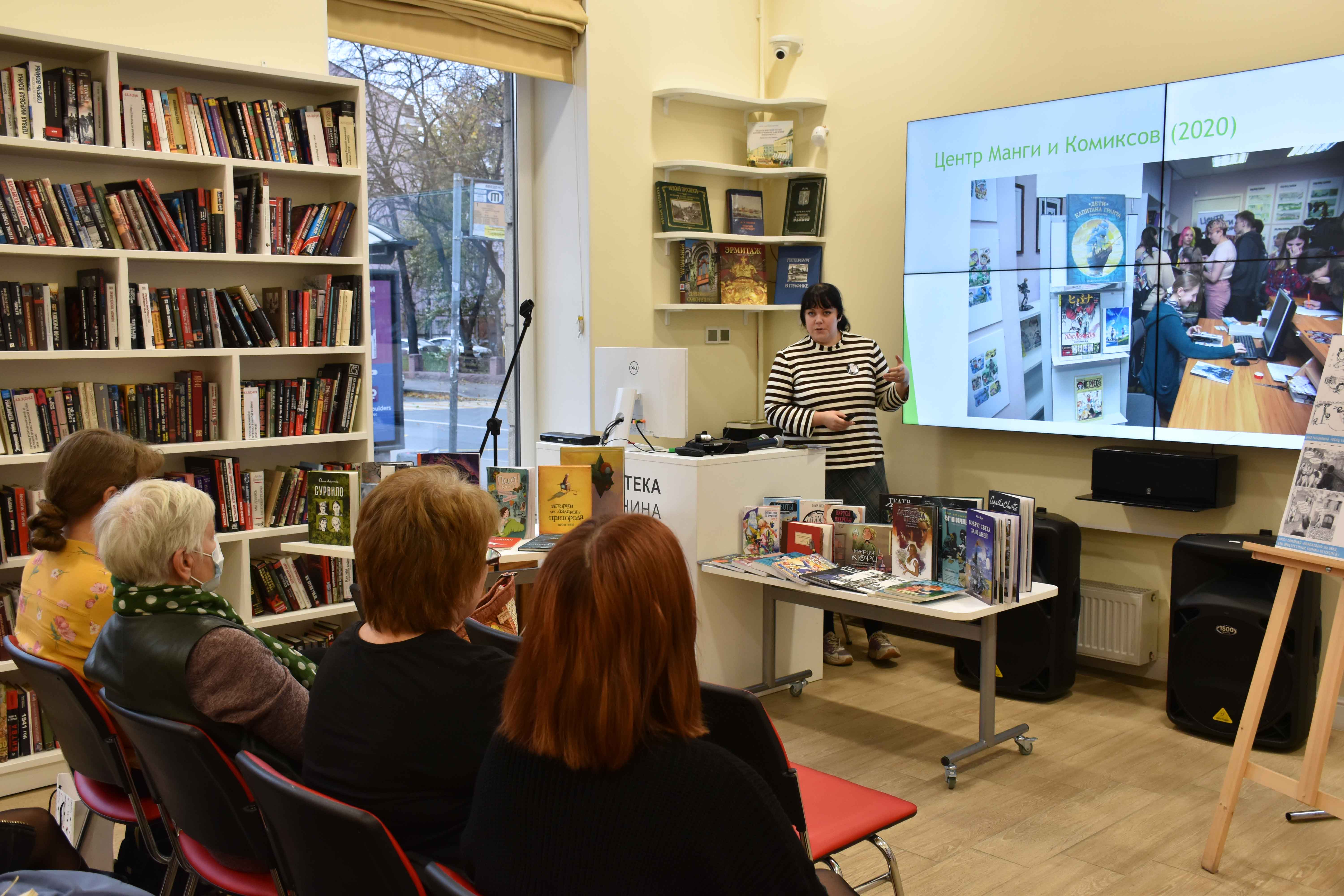 В этот же день для специалистов муниципальных и школьных библиотек был проведён круглый стол «Комикс, манга, графический роман в петербургской библиотеке». Своим большим и полезным опытом по работе с мангой поделилась Юлия Тарасюк, куратор Центра манги и комиксов на базе Библиотеки им. А.П. Чехова Фрунзенского района. Заведующая отделом обслуживания Библиотеки Ленина Евгения Бирюлина рассказала про комикс-адаптации мировой классики, чем они хороши, посоветовала, какие биографии писателей в комиксах стоит почитать. Библиотекарь ГБОУ Гимназия №70 Мария Казанская показала, какие комиксы читают дети в её школе, какие сюжеты их увлекают. Специалист по связям с общественностью Библиотеки Ленина Снежана Мажекенова погрузила слушателей в мир научно-популярных комиксов и рассказала о реализации проекта «Литературная карта России в комиксах».