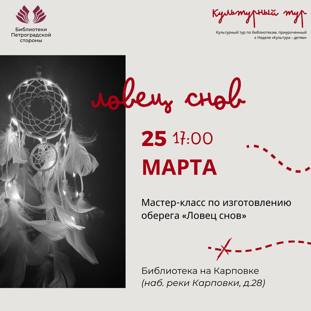 25 марта в 17.00 в Библиотеке на Карповке (наб. реки Карповки, д.28) пройдёт мастер-класс по изготовлению оберега «Ловец снов». Участники узнают историю появления этого амулета, для чего он нужен и как его можно использовать в наши дни.