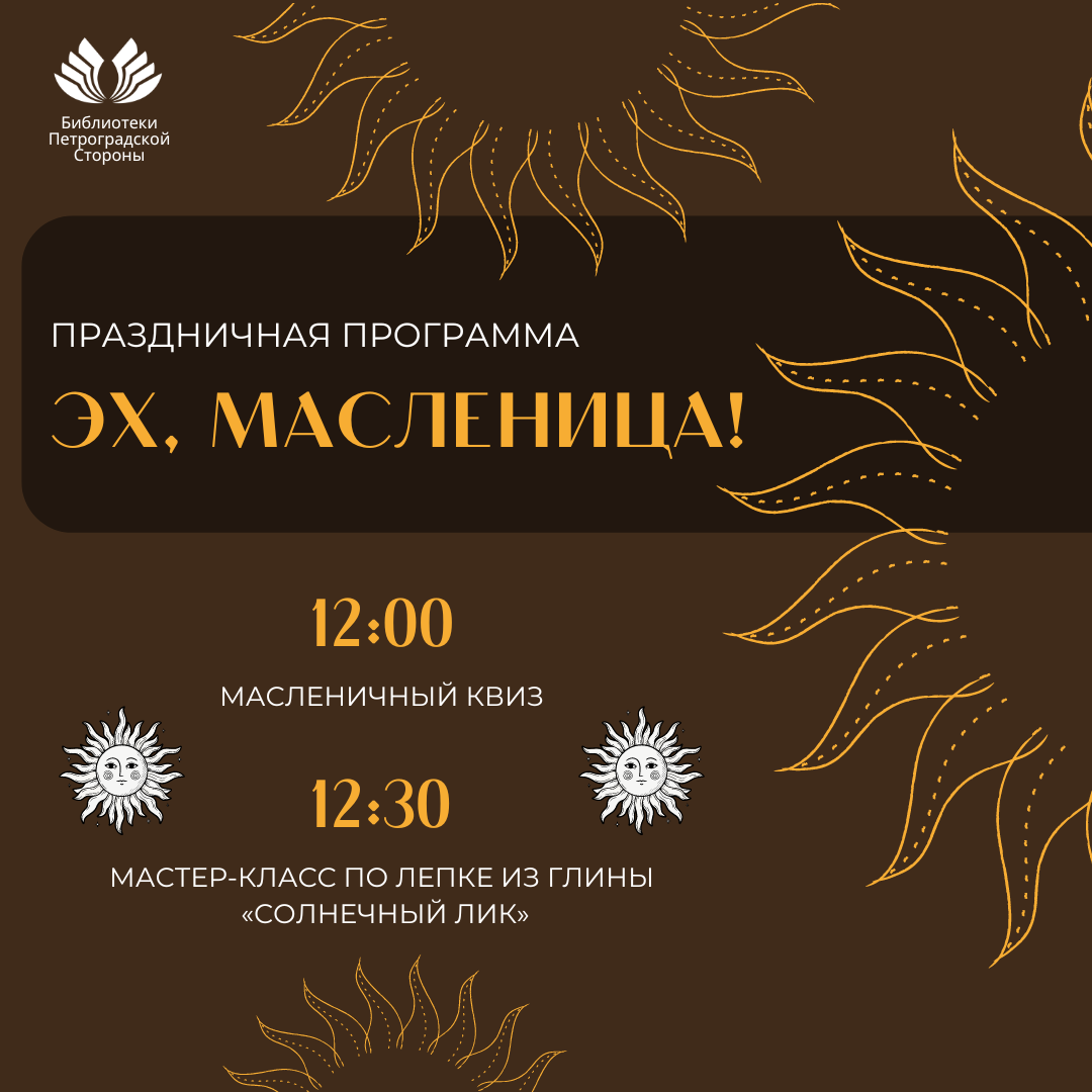 17 марта в 12.00 в библиотеке имени В.И. Ленина (ул. Воскова, д.2) состоится праздничная программа «Эх, Масленица». В программе масленичные квиз, где участники познакомятся с народными обычаями, традициями и мастер-класс по созданию настоящего весеннего солнца!