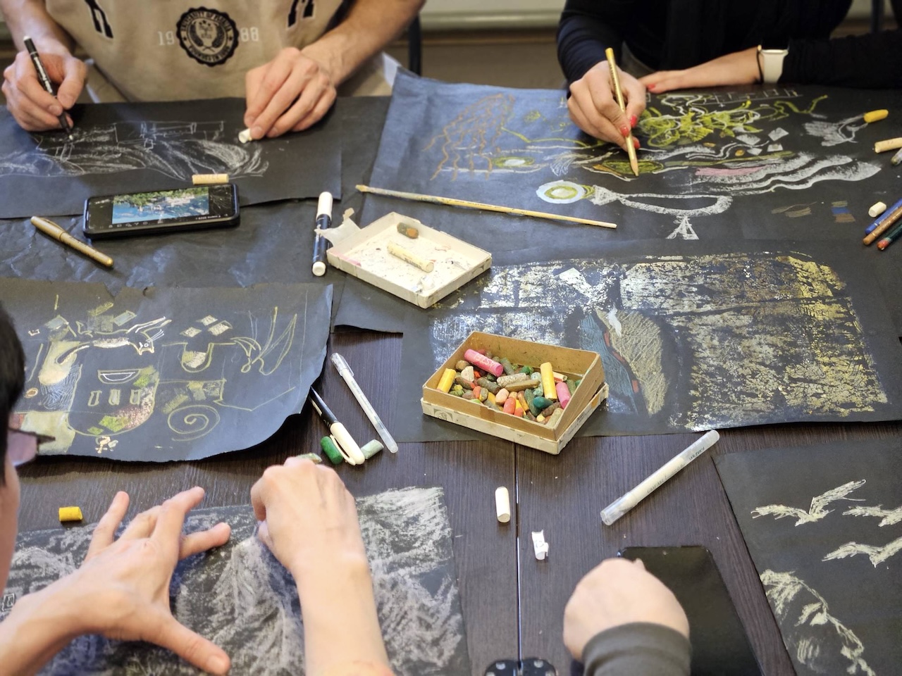 Глубокие тона тонированной бумаги стали прекрасной основой для работы, насыщенные цвета акрила гармонично сочетались с мягкостью цветных карандашей, а добавление масляной пастели придавало изображению особую текстуру и глубину. Использование смешанной техники позволило добиться необычного и интересного эффекта. Участники творили вместе на одном полотне, раскрывая свои творческие способности, и остались под большим впечатлением от процесса и результатов.