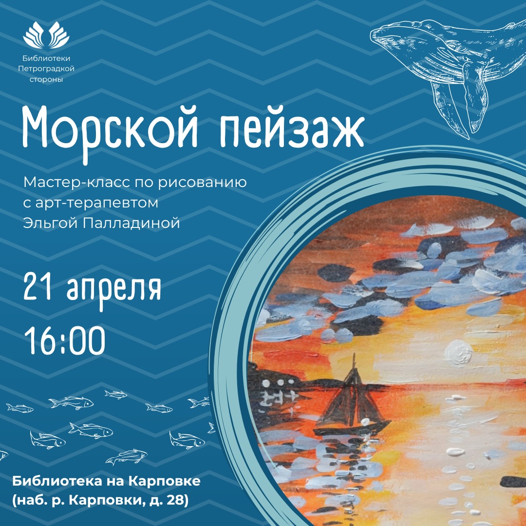 21 апреля 2025 года в 16:00 в библиотеке имени Б. Лавренева (наб. р. Карповки, д. 28) состоится увлекательный мастер-класс по рисованию «Морской пейзаж» с арт-терапевтом Эльгой Палладиной https://vk.com/elga_palladina.