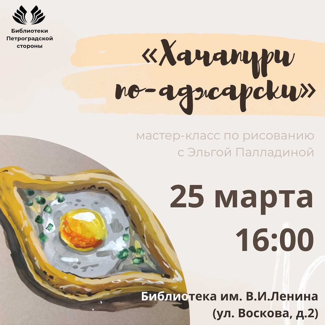 25 марта в 16.00 в библиотеке имени В.И. Ленина (ул. Воскова, д. 2) в рамках Культурного тура по Библиотекам Петроградской стороны, посвящённого Всероссийской неделе «Культура детям», пройдет мастер-класс по рисованию гуашью «Хачапури по-аджарски».