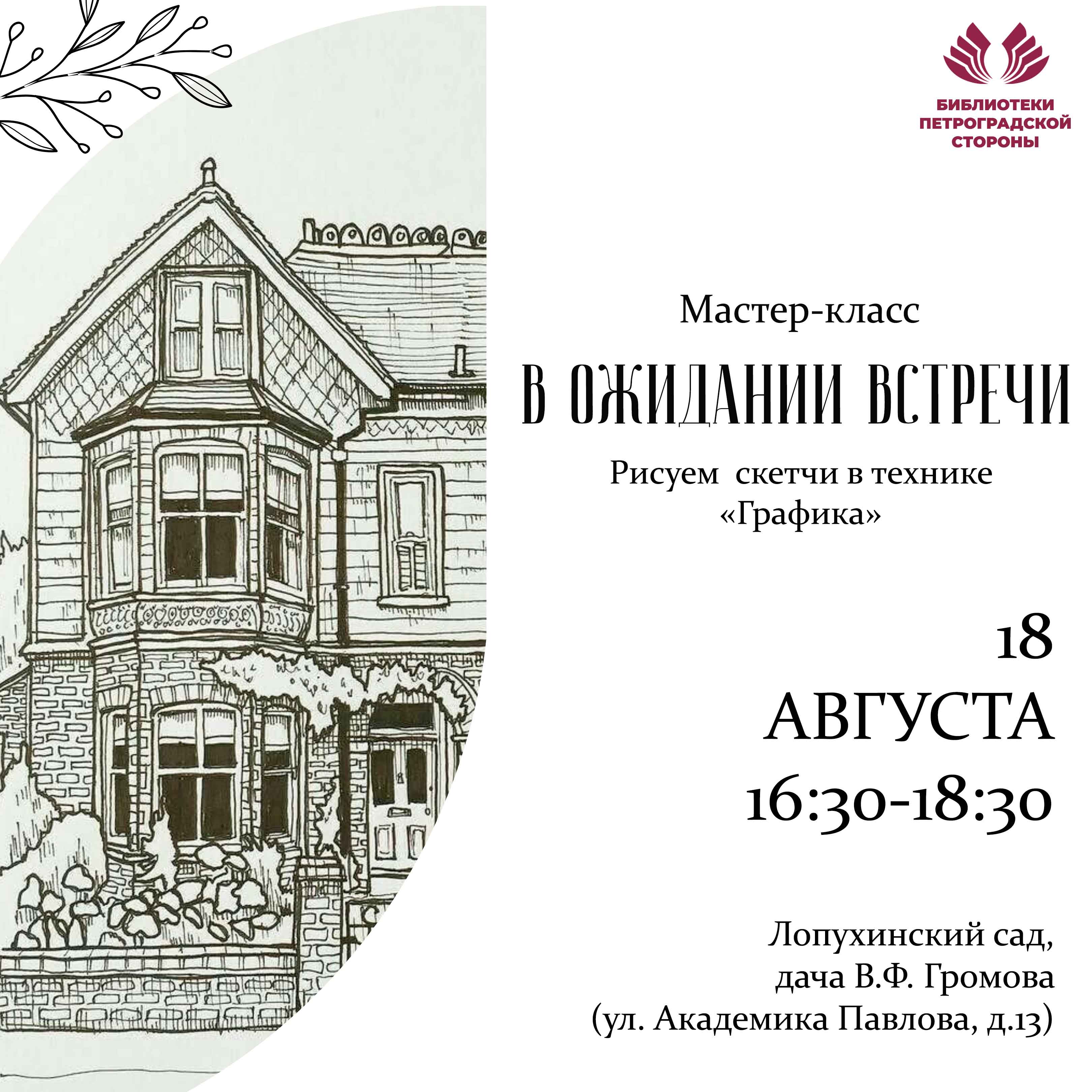 Научимся не бояться белого листа, в технике «Графика» нарисуем архитектурный скетч – красивый романтичный вид Лопухинского сада с дачей Громова. Участникам мастер-класса необходимо иметь с собой: бумагу формата А4 (альбомный лист), планшет (любую твёрдую подложку), цветные карандаши, на выбор: линеры, гелиевые ручки черные, синие, а также плед для комфортного занятия творчеством или стульчик. 12+
