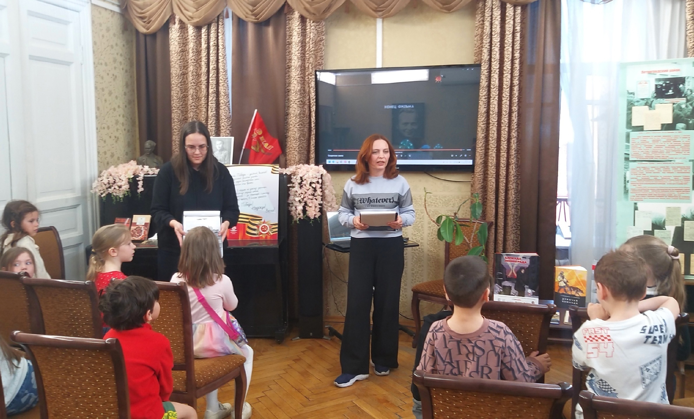 К знаменательным датам — 80-летию Победы в Великой Отечественной войне и 95-летию библиотеки им. А.П. Гайдара — для юных зрителей был организован показ документального фильма «Мгновения блокадной библиотеки». В основу сюжета легла история жизни библиотеки в военные и блокадные годы и воспоминания первой заведующей библиотекой Алевтины Тулиновой.