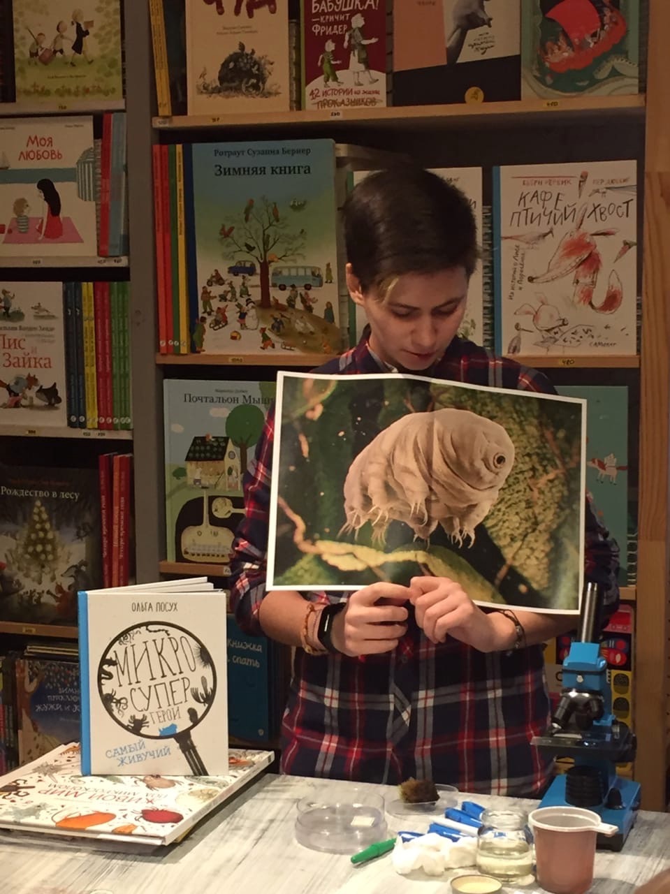 Мы рассмотрели книги «Микросупергерои. Самый живучий» и «Микросупергерои. Самые-самые самовосстанавливающиеся», поэкспериментировали с бумажной планарией, чтобы выяснить её способности к регенерации, поумилялись аксолотлю и заглянули в микроскоп, чтобы полюбоваться на тихоходку и мир, в котором она живёт.