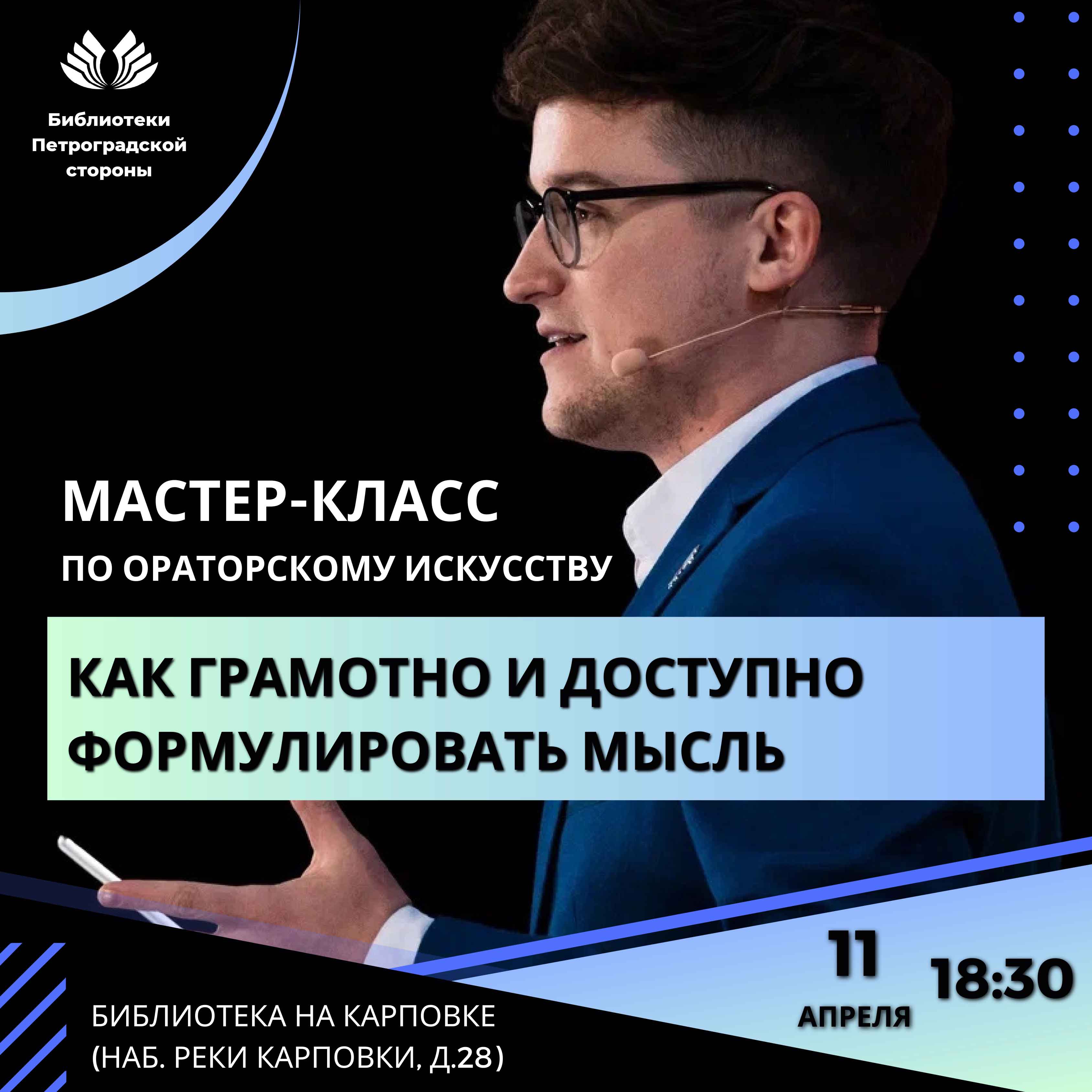 11 апреля в 18:30 в Библиотеке на Карповке (наб.реки Карповки, д.28) пройдет мастер-класс по ораторскому искусству «Как грамотно и доступно формулировать мысль».