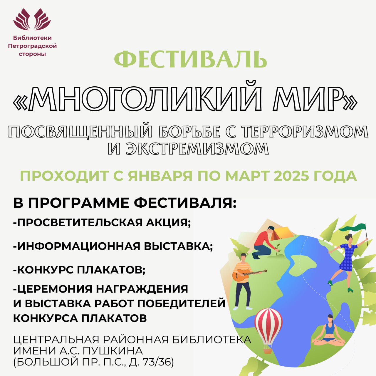 Фестиваль «Многоликий мир», посвященный борьбе с терроризмом и экстремизмом пройдёт с 17 января по 09 марта 2025 года в Центральной районной библиотеке имени А.С. Пушкина (Большой пр. П.С., д. 73/36).